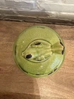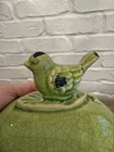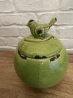 This Green Crackle Glaze Round Decorative Vase with Bird on Lid is a traditional farmhouse-style piece made of clay and ceramic. The vase, measuring 8 inches in height and 7.5 inches in width, features a glossy finish and an arts & crafts/mission style design. The decorative bird on the lid adds a charming touch to the piece, making it a perfect addition to any home decor collection. Crafted in 2010, this original artwork pottery vase is a unique and eye-catching item for any space.