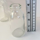 Farmhouse Metal Basket With Four Small Creamer Bottles Flower Vases Propagation Baset is approximately 5" Bottles are approximately 4" tall All Bottles and basket weigh approximately 1 lb Good condition. No chips or cracks. Bottles have a little cloudiness in the bottom and a little speck of debris in one bottle.