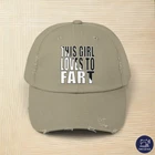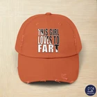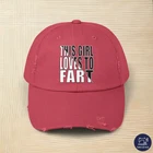This girl loves to fart design with a cartoonish fart cloud and a funny and cool pun, quote or slogan. Perfect for anyone (women, men and kids) with a sense of humor and a love for flatulence. For everyone who loves farting, free energy, natural, fart, saying, stinky, gas, wind, flatus, pooting, tooting, smelly, college, disgusting, rude, offensive PRODUCT DESCRIPTION Made with 100% cotton twill for high-end comfort and durability, these custom distressed hats bring all the style and practicality one needs in daily life. The low profile along with the D-ring closure on a self-fabric hideaway strap ensures both proper protection from the sun and that perfect, adjustable fit. .: 100% cotton twill .: Sewn-in label .: Closure: self-fabric hideaway strap with metal D-ring slider .: Printed using Direct to Film (DTF) technology .: Please note: Due to a special finishing process, distress and color may vary SIZE GUIDE Imperial One size Crown height, in 6.50 Width of front panel, in 7.37 Bill length, in 2.87 Metric One size Crown height, in 16.51 Width of front panel, in 18.73 Bill length, in 7.30
