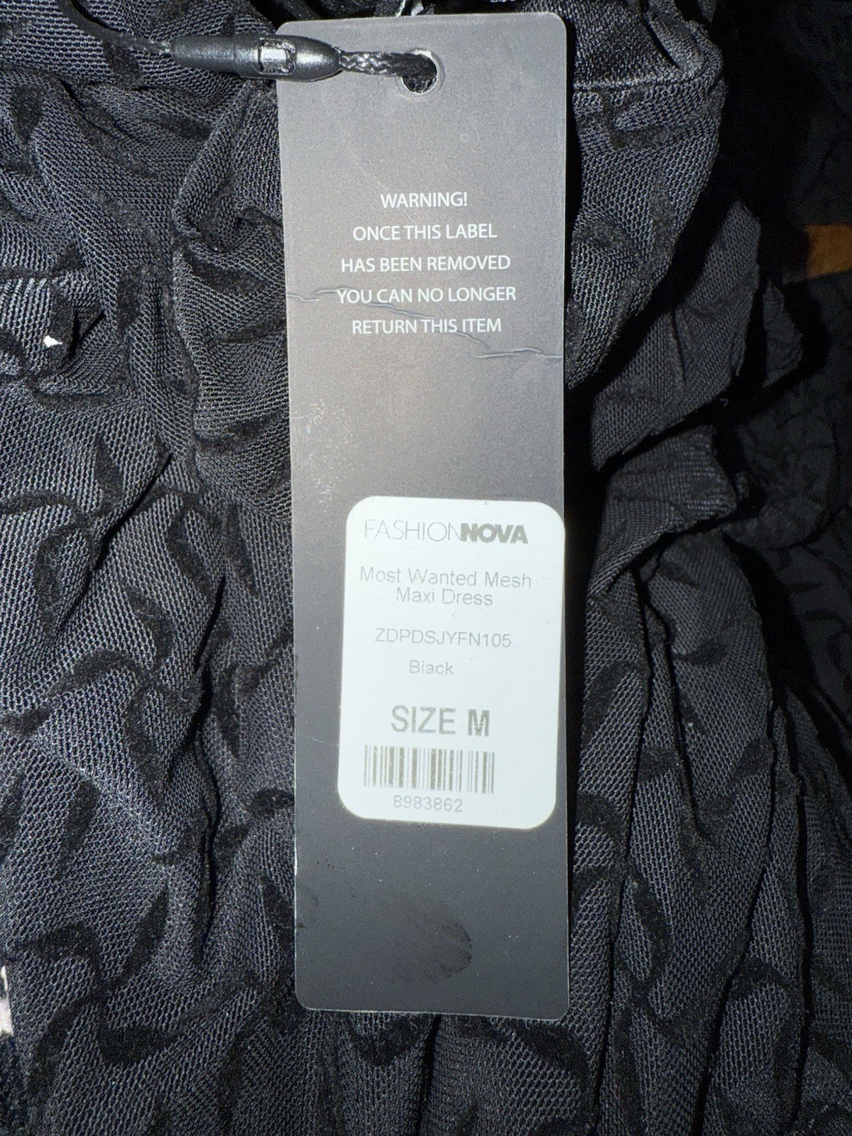 The Fashion Nova Black Sheer Maxi Dress is a stylish and glamorous choice for any party or cocktail occasion. Made from polyester mesh fabric, this long dress features a solid black color and a backless design that adds a touch of sophistication. The maxi length and long sleeves make it perfect for summer and spring events, while the regular fit and size M ensure a comfortable and flattering look for women who want to make a statement at their next special event.