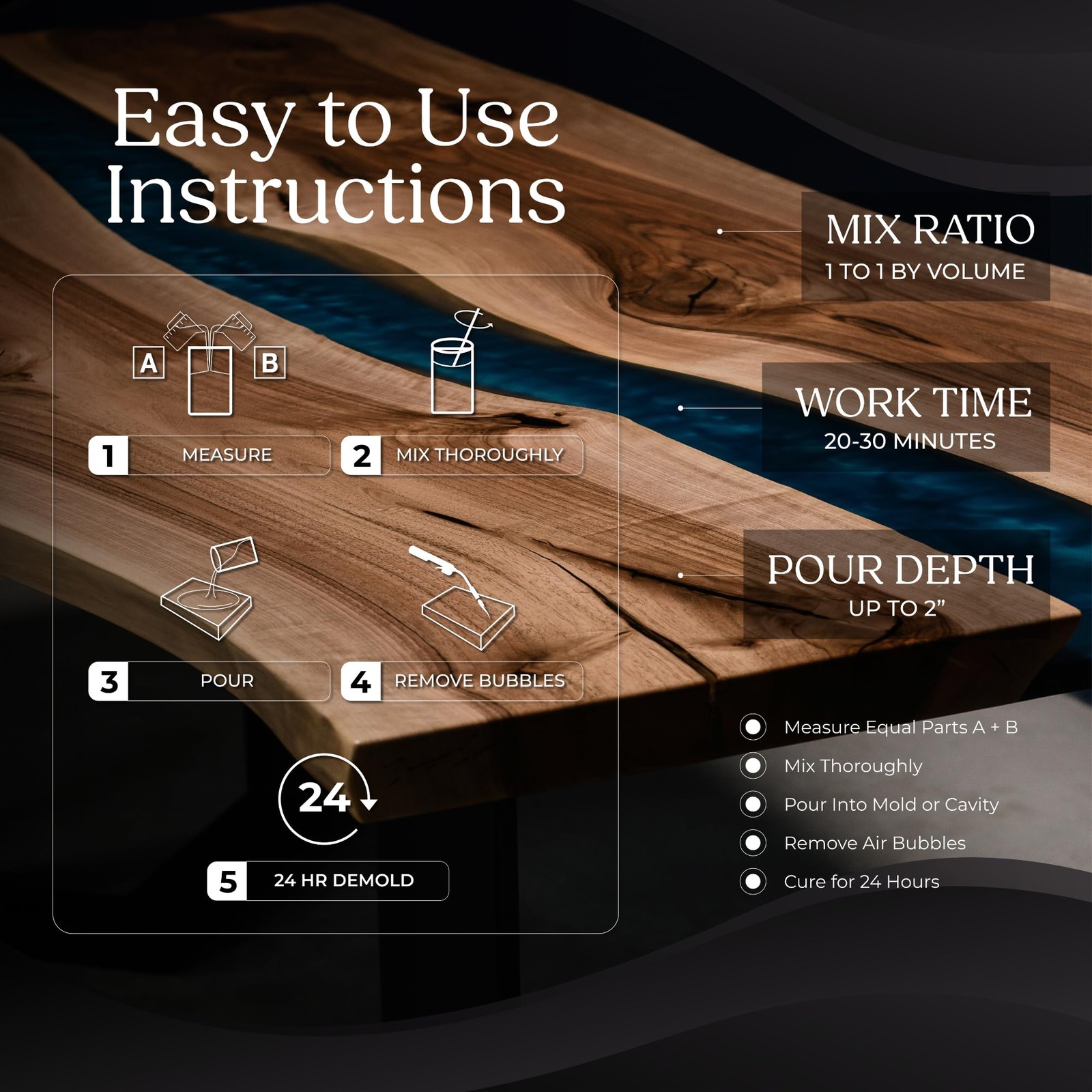 Discover the next level of precision and efficiency with 's Fast Cure Deep Pour Resin. Specifically designed for craftsmen, artists, and woodworkers, this resin is perfect for smaller projects that demand speed, clarity, and exceptional quality. Whether you're creating wood art, deep small molds, charcuterie boards, or small resin flowers encapsulation, this versatile epoxy offers unmatched performance, making it an essential choice in your resin supplies and resin accessories for achieving professional-grade results effortlessly. The user-friendly 1:1 mix ratio simplifies your workflow, ensuring easy and accurate mixing every time. With superior UV resistance, your creations are protected from yellowing, maintaining long-lasting clarity and brilliance. The fast-curing formula sets in just 24 hours, dramatically reducing waiting times compared to traditional deep pour epoxies, and enhancing your productivity. This quick set resin is a is safe for use on food-contact surfaces, making it ideal for charcuterie boards and other culinary projects. It delivers the flawless, crystal-clear finish that is renowned for, bringing out the best in every detail of your work. However, please note that this epoxy is not suitable for large or deep pours over 1/2 inch, such as river table, as it is specifically designed for smaller, intricate projects that require precision and clarity. For those who prioritize efficiency without compromising on quality, Fast Cure Deep Pour Resin is the perfect solution to enhance your productivity and achieve stunning results with every pour. Versatile Epoxy Applications - Perfect for epoxy resin art projects like small encapsulations, resin charms, deep small molds, charcuterie boards, and small end tables. This kit is formulated for smaller pieces needing depth and clarity. Fast Cure Time - Our fast cure epoxy resin deep pour cures overnight, allowing you to demold in just 24 hours—much faster than traditional deep pour epoxies. It provides crystal clear results quickly, making it perfect for intricate projects. High-Quality Gloss Finish - This epoxy resin has a clear gloss finish and superior UV resistance, ensuring that your art resin projects remain beautiful and clear over time, resisting yellowing and degradation. User-Friendly Epoxy Kit - Our clear epoxy resin offers a simple 1:1 mix ratio making it easy to use. This kit is an ideal choice for beginners, DIY enthusiasts, and those working on small projects. Please note that this resin is not suitable for large or deep pours over 1/2 inch. Food-Safe Epoxy Resin - Our fast cure deep pour is a food safe epoxy resin. An ideal choice for projects that involve food contact, such as coasters, cookie end tables. American Made Excellence - With over 40 years of experience, brings American-made quality to the forefront of epoxy resin craftsmanship. Our focus on formula perfection sets our products apart.