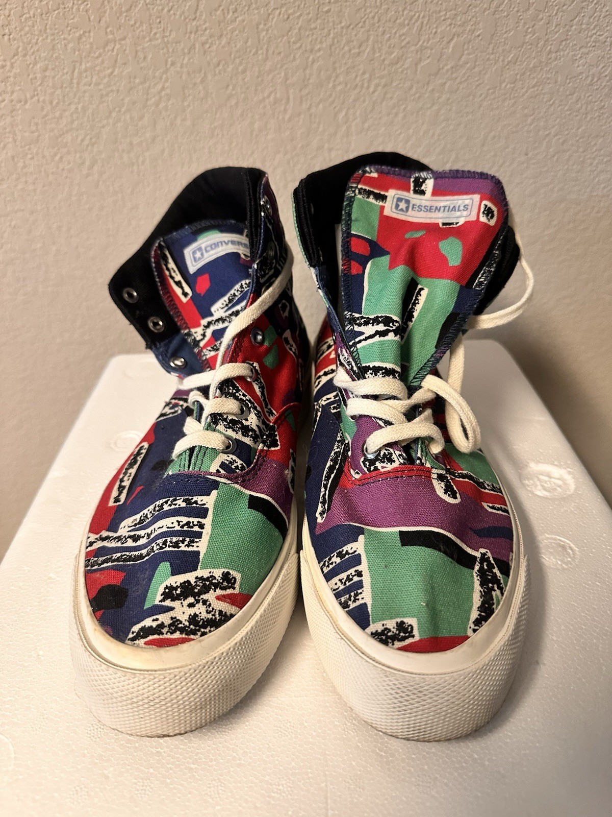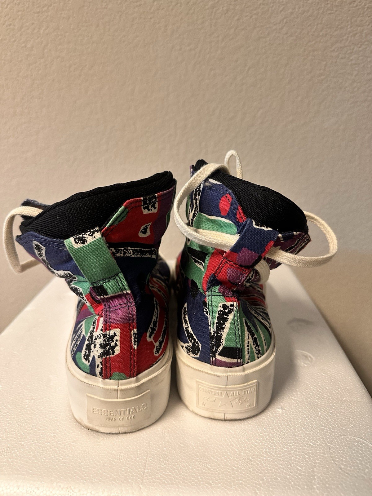 The Fear of God Essentials Converse Skid Grip 169888C is a unisex men's sneaker in size 9. This high top lace-up shoe features a colorful colorblock design with skid characters, making it perfect for activewear, casual outings, or workwear. With a rubber outsole and canvas lining, this athletic shoe is ideal for the summer, fall, and spring seasons. The Converse brand, textile upper material, and textile insole ensure a comfortable and stylish option for those looking to add a trendy and unique touch to their footwear collection.