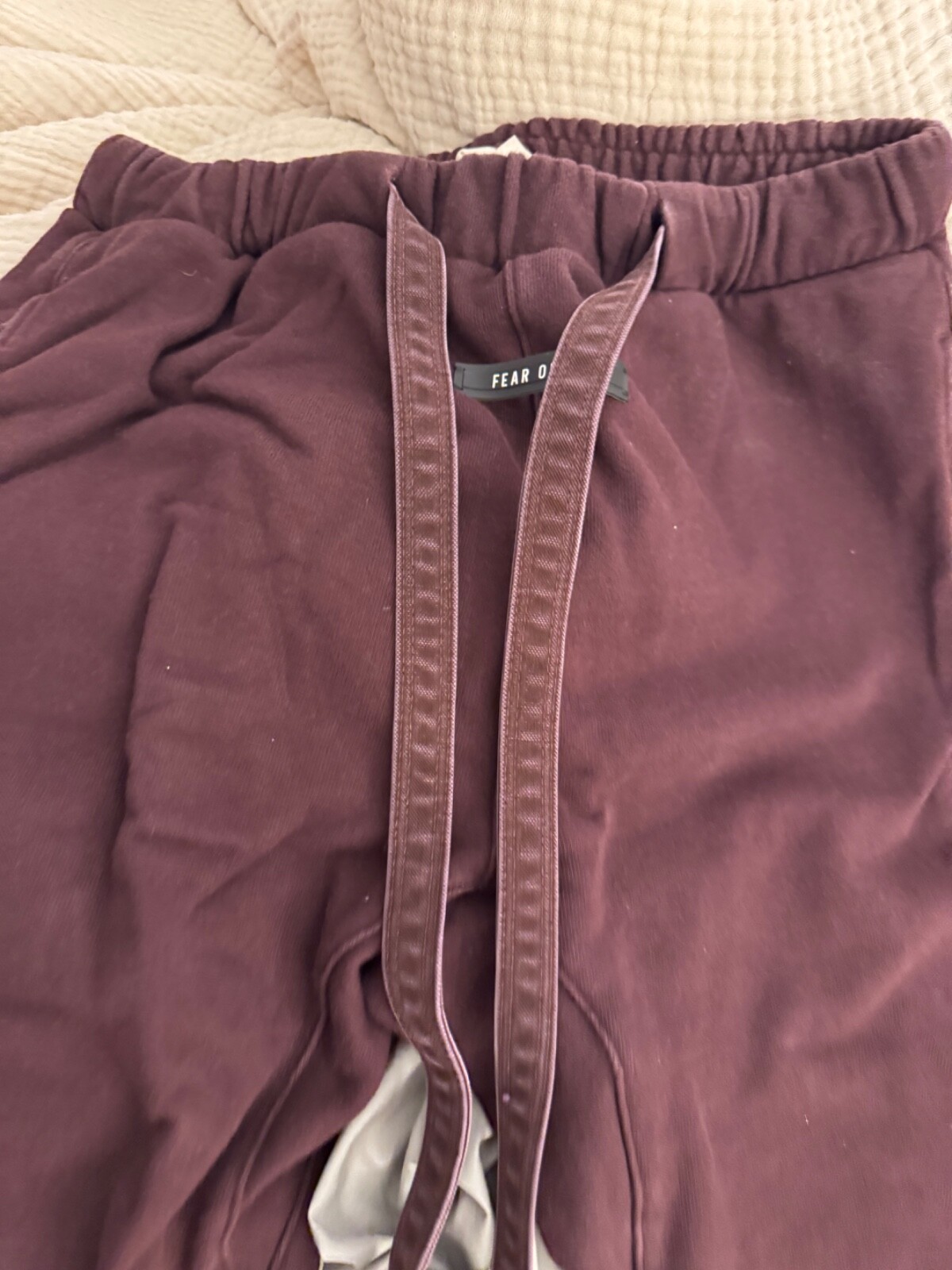 The Fear of God Sixth Collection Relaxed Cotton Sweatpants in Merlot are a rare find in size Medium. These athletic-style pants feature a reflective detail, making them stand out in both style and functionality. Made from comfortable cotton material, these sweatpants are designed with a relaxed fit for a modern and trendy look. Perfect for casual wear or athleisure outfits, these pants from the Fear of God brand are a stylish addition to any wardrobe.