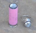 Federal Pink 12 Gauge Shotgun Shell Bullet Pill Bottle Keychain. Made from a used fired shotgun shell. Nickel finish metal is highly polished. Made in the USA.