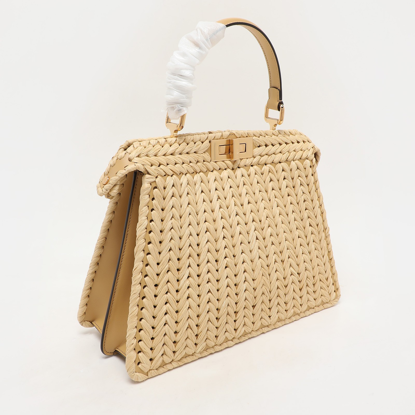 Experience the art of Italian elegance with this beige woven masterpiece. Crafted with precision, it brilliantly combines supple leather and natural straw, showcasing a harmonious texture that exudes luxury. Its structured silhouette is accentuated by a top handle, offering both style and practicality. Inside, the leather lining provides a testament to impeccable craftsmanship. Perfect for women who cherish exclusivity, this bag is an exquisite addition to any sophisticated wardrobe.Certified by The Luxury Closet - This item has gone through a detailed authentication process overseen by our experts. We offer a lifetime guarantee of authenticity on all our items. Import duties, taxes and charges are not included in the item price. These charges are the buyers responsibility. Please check with your country’s customs office to determine what these additional cost will be prior to buying. Our eBay Store About Us Contact Us Add to Favorite Sellers Fendi Beige Woven Leather and Straw Peekaboo Medium Iseeu Top Handle Bag $4088.7 Experience the art of Italian elegance with this beige woven masterpiece. Crafted with precision, it brilliantly combines supple leather and natural straw, showcasing a harmonious texture that exudes luxury. Its structured silhouette is accentuated by a top handle, offering both style and practicality. Inside, the leather lining provides a testament to impeccable craftsmanship. Perfect for women who cherish exclusivity, this bag is an exquisite addition to any sophisticated wardrobe. Product Details Brand Color Beige Dimensions Height: 25 cm, Width: 13 cm, Length: 33 cm Material Leather, Straw Size Outsole Width Outsole Length Heel Height Includes Original Dustbag, Info Booklet, Detachable Strap, Rain cover, Brand Tag Certified by The Luxury Closet This item has gone through a detailed authentication process overseen by our experts. We offer a lifetime guarantee of authenticity on all our items. How We Check The in-house team of experts at The Luxury Closet is highly trained to verify the authenticity and the condition of the luxury products. They ensure that only 100% authentic items are put on sale.The evaluation process is unique with its own mix of assessment criteria and differs according to the category. Each item is evaluated based on the following combination of hallmarks, hardware, stitching, symmetry, material, craftsmanship, stamping, codes, hologram stickers, and packaging. Our authenticators also check if the items have been modified or amended (e.g., aftermarket diamonds, replaced batteries, repaired bags, etc.) International Buyers Import duties, taxes and charges are not included in the item price. These charges are the buyers responsibility. Please check with your country’s customs office to determine what these additional cost will be prior to buying.