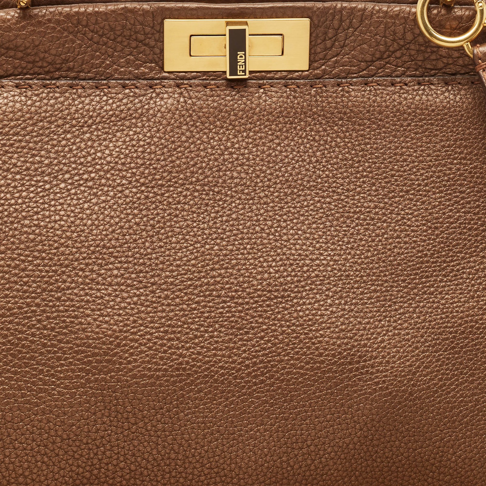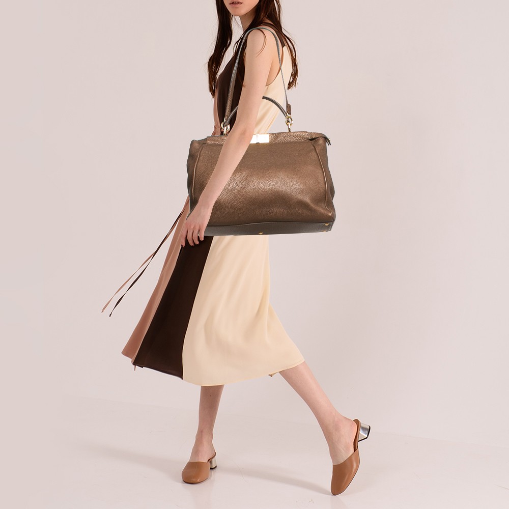 A classic handbag comes with the promise of enduring appeal, boosting your style time and again. This designer bag is one such creation. It’s a fine purchase.Certified by The Luxury Closet - This item has gone through a detailed authentication process overseen by our experts. We offer a lifetime guarantee of authenticity on all our items. Import duties, taxes and charges are not included in the item price. These charges are the buyers responsibility. Please check with your country’s customs office to determine what these additional cost will be prior to buying. Our eBay Store About Us Contact Us Add to Favorite Sellers Fendi Bronze Selleria Leather Large Peekaboo Top Handle Bag $631.4 A classic handbag comes with the promise of enduring appeal, boosting your style time and again. This designer bag is one such creation. It’s a fine purchase. Product Details Brand Color Metallic Dimensions Material Leather Size Large Outsole Width Outsole Length Heel Height Includes Certified by The Luxury Closet This item has gone through a detailed authentication process overseen by our experts. We offer a lifetime guarantee of authenticity on all our items. How We Check The in-house team of experts at The Luxury Closet is highly trained to verify the authenticity and the condition of the luxury products. They ensure that only 100% authentic items are put on sale.The evaluation process is unique with its own mix of assessment criteria and differs according to the category. Each item is evaluated based on the following combination of hallmarks, hardware, stitching, symmetry, material, craftsmanship, stamping, codes, hologram stickers, and packaging. Our authenticators also check if the items have been modified or amended (e.g., aftermarket diamonds, replaced batteries, repaired bags, etc.) International Buyers Import duties, taxes and charges are not included in the item price. These charges are the buyers responsibility. Please check with your country’s customs office to determine what these additional cost will be prior to buying.