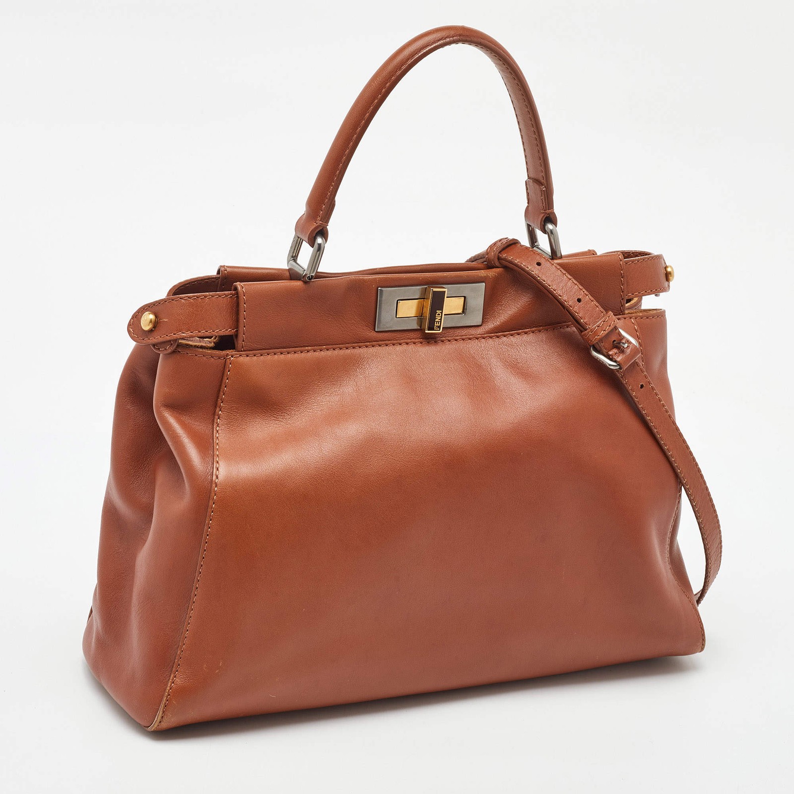 Our eBay Store About Us Contact Us Add to Favorite Sellers Fendi Brown Leather Medium Peekaboo Top Handle Bag Designed by Venturini Fendi, the Peekaboo was first debuted in 2008. The unique construction and representation of this bag enable it to keep up with fashion's ever-changing tide. Constructed from leather, it is complemented with gold tone-metal hardware, a single top handle, and a shoulder strap. The branded twist-turn lock on both sides reveals a lined interior. Product Details Brand Fendi Includes The Luxury Closet Packaging, Brand Tag, Info Card, Detachable Str Certified by The Luxury Closet This item has gone through a detailed authentication process overseen by our experts. We offer a lifetime guarantee of authenticity on all our items. How We Check The in-house team of experts at The Luxury Closet is highly trained to verify the authenticity and the condition of the luxury products. They ensure that only 100% authentic items are put on sale.The evaluation process is unique with its own mix of assessment criteria and differs according to the category. Each item is evaluated based on the following combination of hallmarks, hardware, stitching, symmetry, material, craftsmanship, stamping, codes, hologram stickers, and packaging. Our authenticators also check if the items have been modified or amended (e.g., aftermarket diamonds, replaced batteries, repaired bags, etc.) Please note that this handbag may have a perfume scent, as it was stored and packaged in Dubai where such fragrances are commonly used. International Buyers Import duties, taxes and charges are not included in the item price. These charges are the buyers responsibility. Please check with your country’s customs office to determine what these additional cost will be prior to buying.