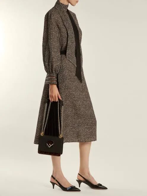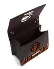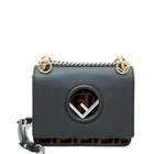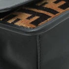 The FF logo is printed all over in velvet shades of black and brown on black calf leather.The handbag from Fendi features a foldover top with flip-lock closure, a top handle, a chain and leather strap, interior compartments divided by a partition and 2 tones hardware.The gusseted interior features a pocket and two compartments divided by a stiff partition. Can be worn cross-body or carried by hand thanks to the detachable shoulder strap with a mix of palladium-finish and gold-finish metalware.
