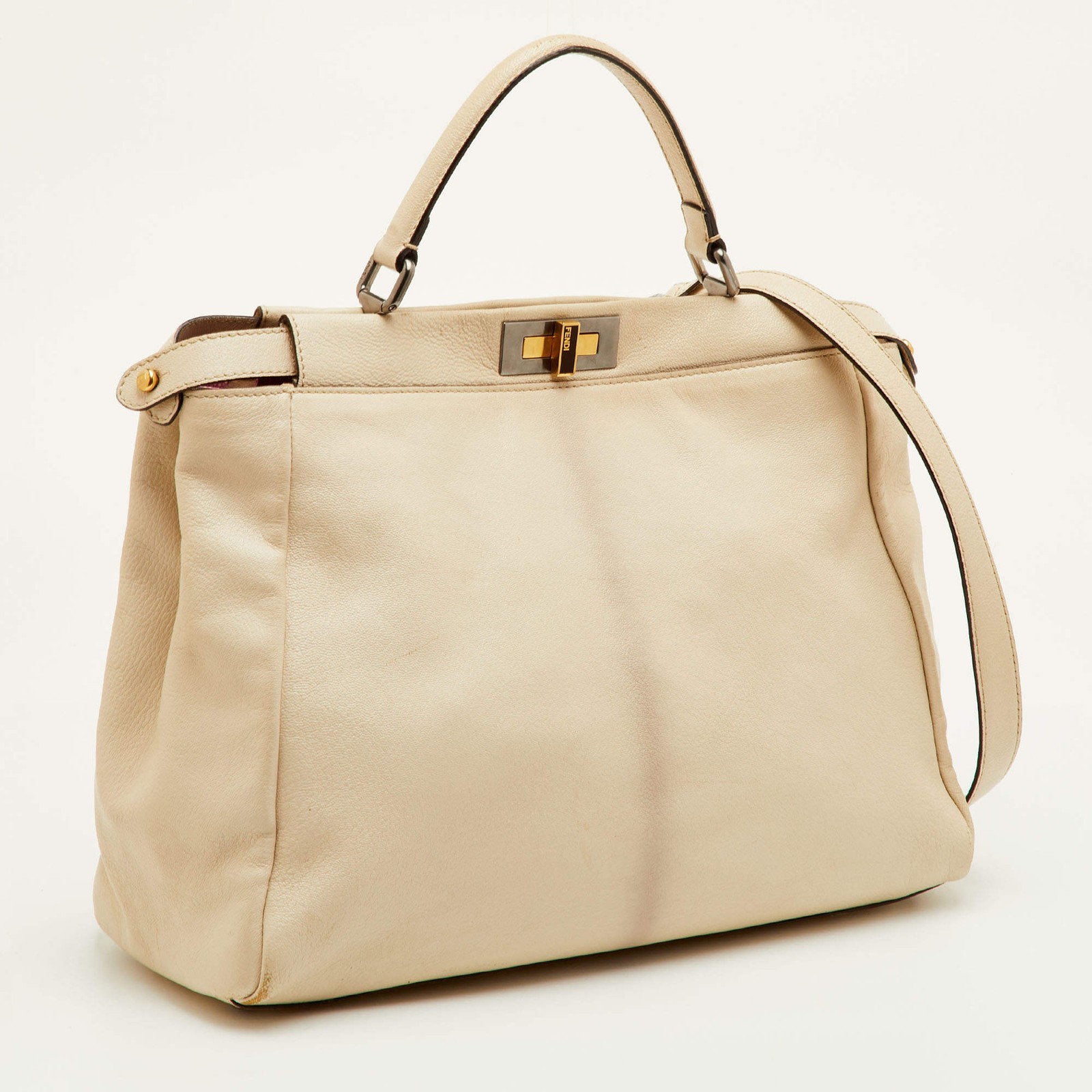 Our eBay Store About Us Contact Us Add to Favorite Sellers Fendi Peekaboo Large Cream Leather Top Handle Bag Now an icon in the handbag world, Fendi's Peekaboo has been winning hearts since 2009. It is a classic top-handle bag beloved for its shape, versatility, and fun twist lock on each side. This preloved one in cream leather is a large size version, and it has a striking stingray leather interior meant to be seen when the lock is left open. A Fendi beauty you can carry for work and travel. Product Details Brand Fendi Includes The Luxury Closet Packaging, Detachable Strap Certified by The Luxury Closet This item has gone through a detailed authentication process overseen by our experts. We offer a lifetime guarantee of authenticity on all our items. How We Check The in-house team of experts at The Luxury Closet is highly trained to verify the authenticity and the condition of the luxury products. They ensure that only 100% authentic items are put on sale.The evaluation process is unique with its own mix of assessment criteria and differs according to the category. Each item is evaluated based on the following combination of hallmarks, hardware, stitching, symmetry, material, craftsmanship, stamping, codes, hologram stickers, and packaging. Our authenticators also check if the items have been modified or amended (e.g., aftermarket diamonds, replaced batteries, repaired bags, etc.) International Buyers Import duties, taxes and charges are not included in the item price. These charges are the buyers responsibility. Please check with your country’s customs office to determine what these additional cost will be prior to buying.