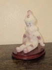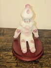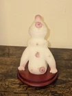 The Fenton Art Glass Berries And Blossoms Sitting Clown is a hand-painted figurine made of milk satin glass. Featuring a clown theme with blossoms and berries pattern, this art glass piece embodies a whimsical and colorful aesthetic. The figurine comes with a stand for display, showcasing the intricate workmanship and attention to detail that Fenton is known for in their decorative pottery and glassware creations.