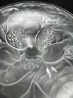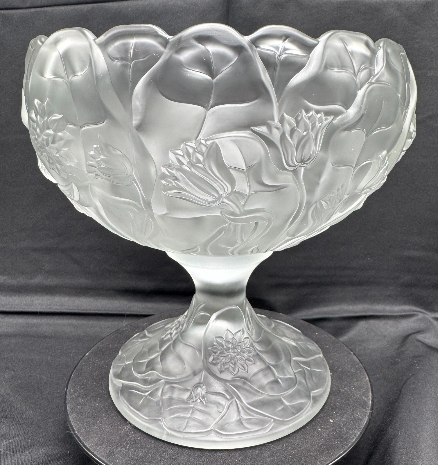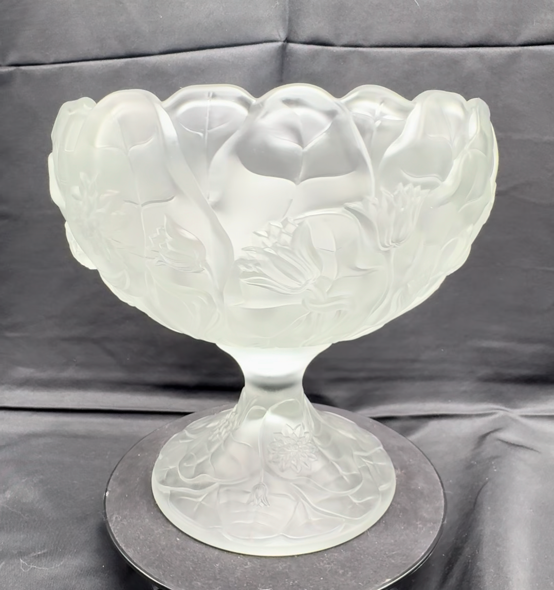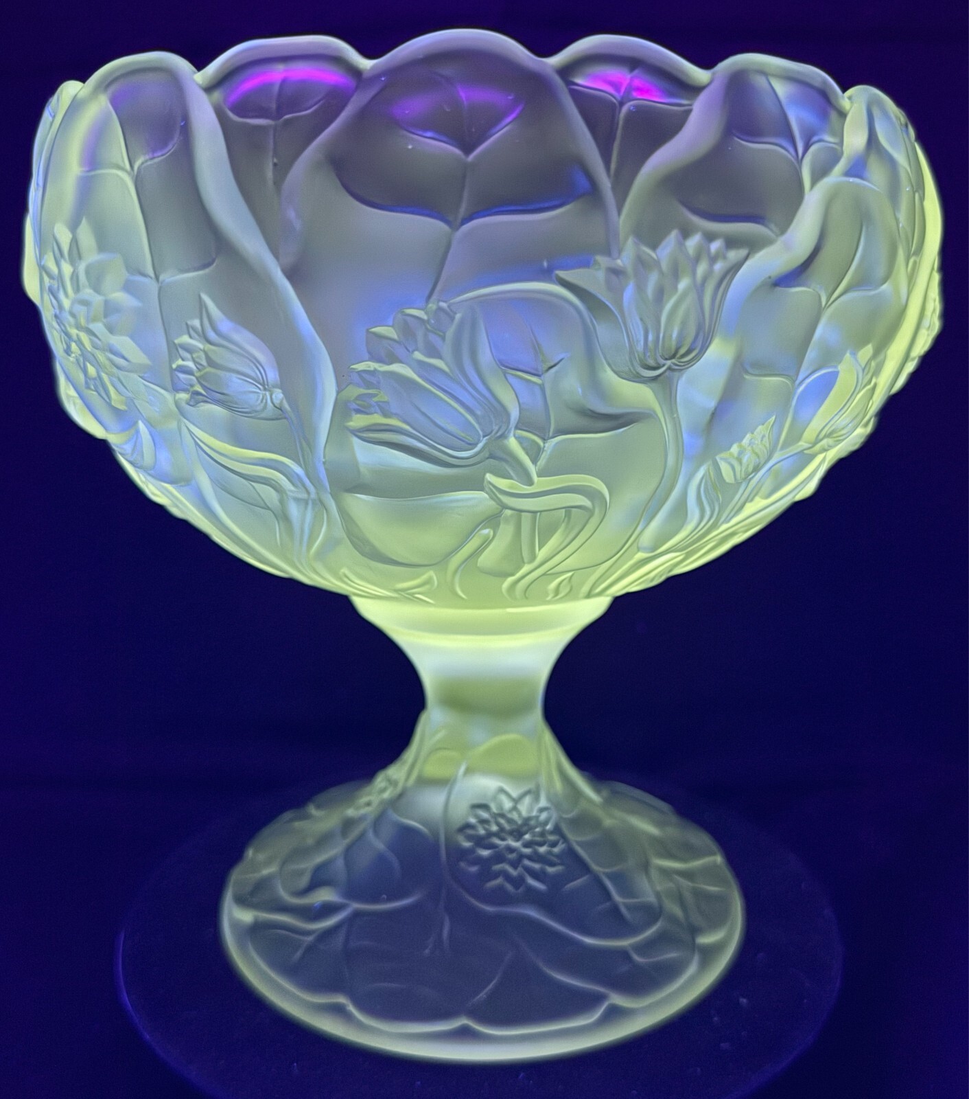 Fenton Clear Frosted Manganese Glass Water Lily Footed Bowl Comport This glows ghostly green under 365 wavelength black lights. This is due to the manganese used in the manufacturing of the glass. Does not glow under 395 wavelength light.