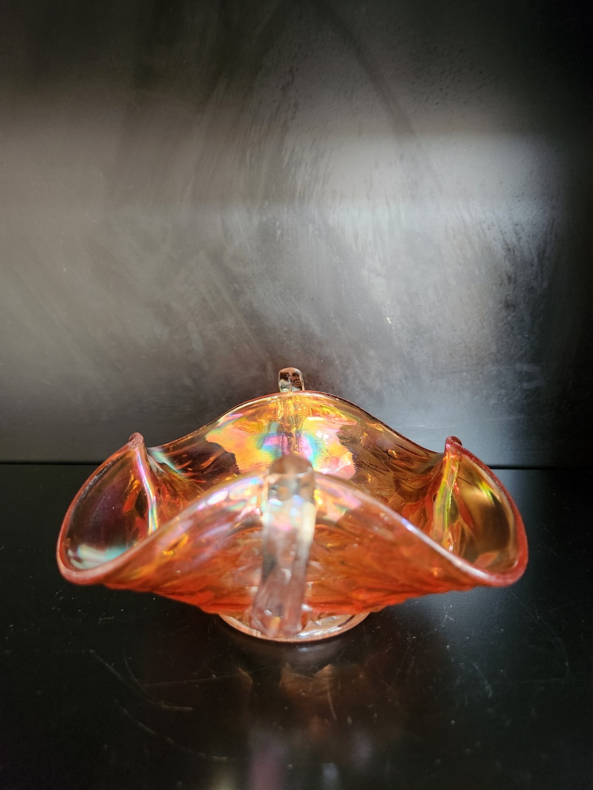 The Fenton 'Honeycomb & Clover' Marigold Carnival Glass Bonbon Dish with 2 Handles is a beautiful and elegant bowl made of glass. It features a square shape with a honeycomb pattern in a vibrant gold color, perfect for all occasions. This original piece from 1965 includes handles for easy carrying, making it a unique and collectible addition to your dinnerware collection. With its glossy finish and compact size of 2.5 inches in height and 7 inches in width, this bonbon dish is a stunning and decorative piece for your kitchen or dining table.
