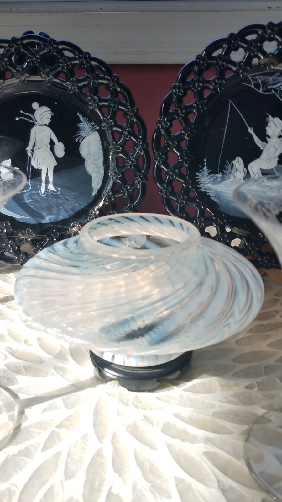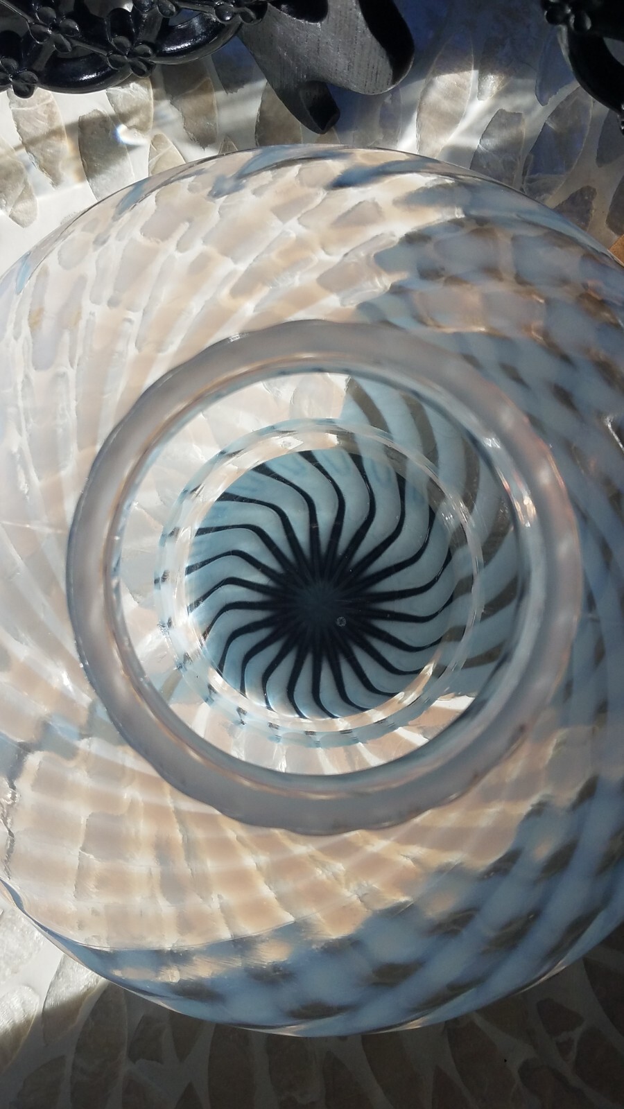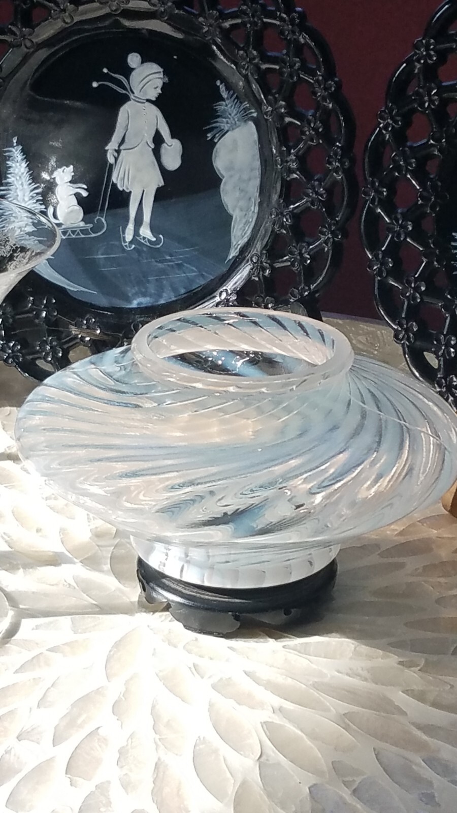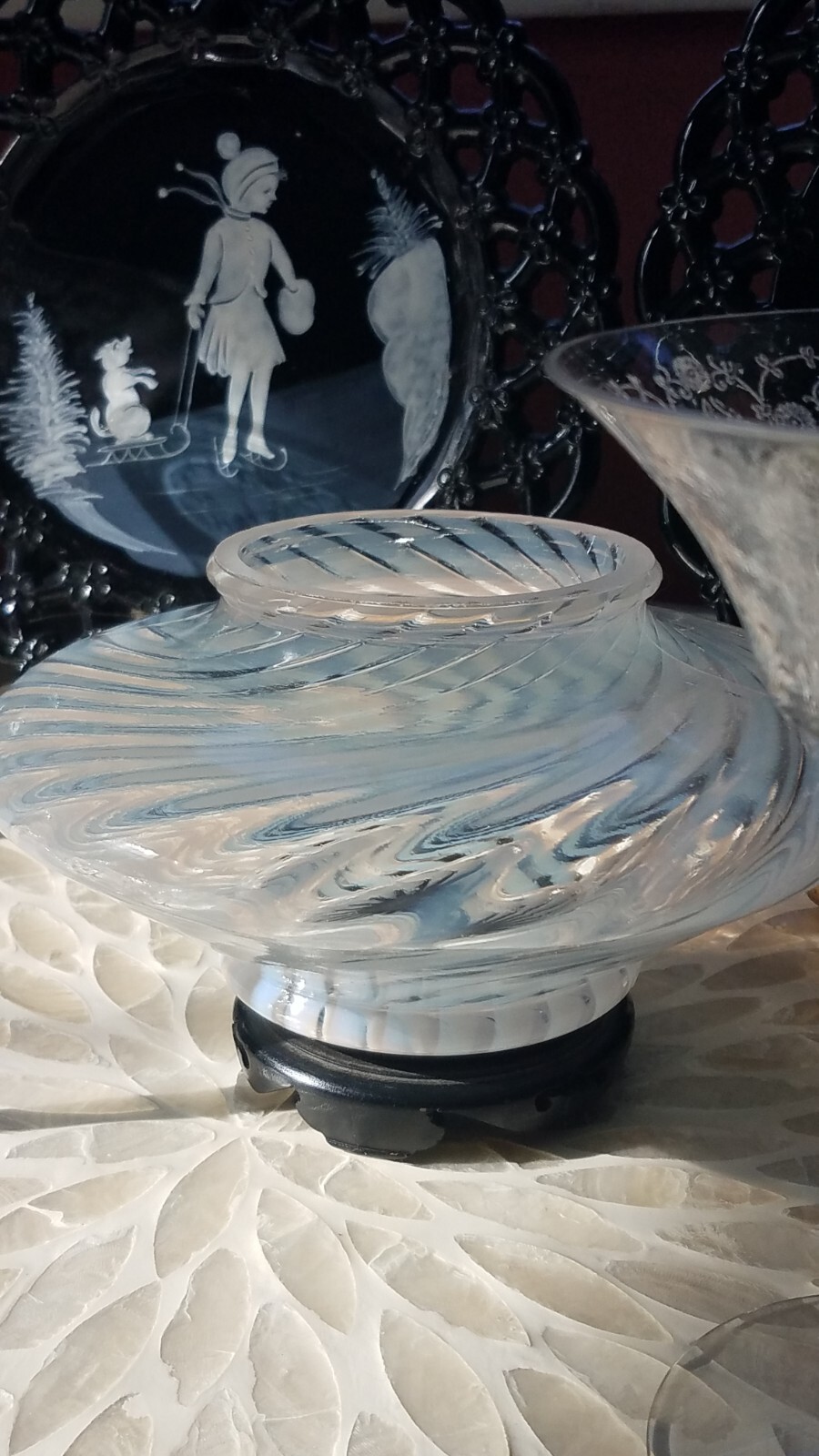 This stunning Fenton vase is a true gem! The opalescent swirl design catches the light beautifully, and the unusual spiral optic pattern adds a unique touch. It’s in perfect condition—no cracks or chips—and the frosted finish gives it an elegant look. The squat shape makes it a great display piece. A must-have for glass collectors!