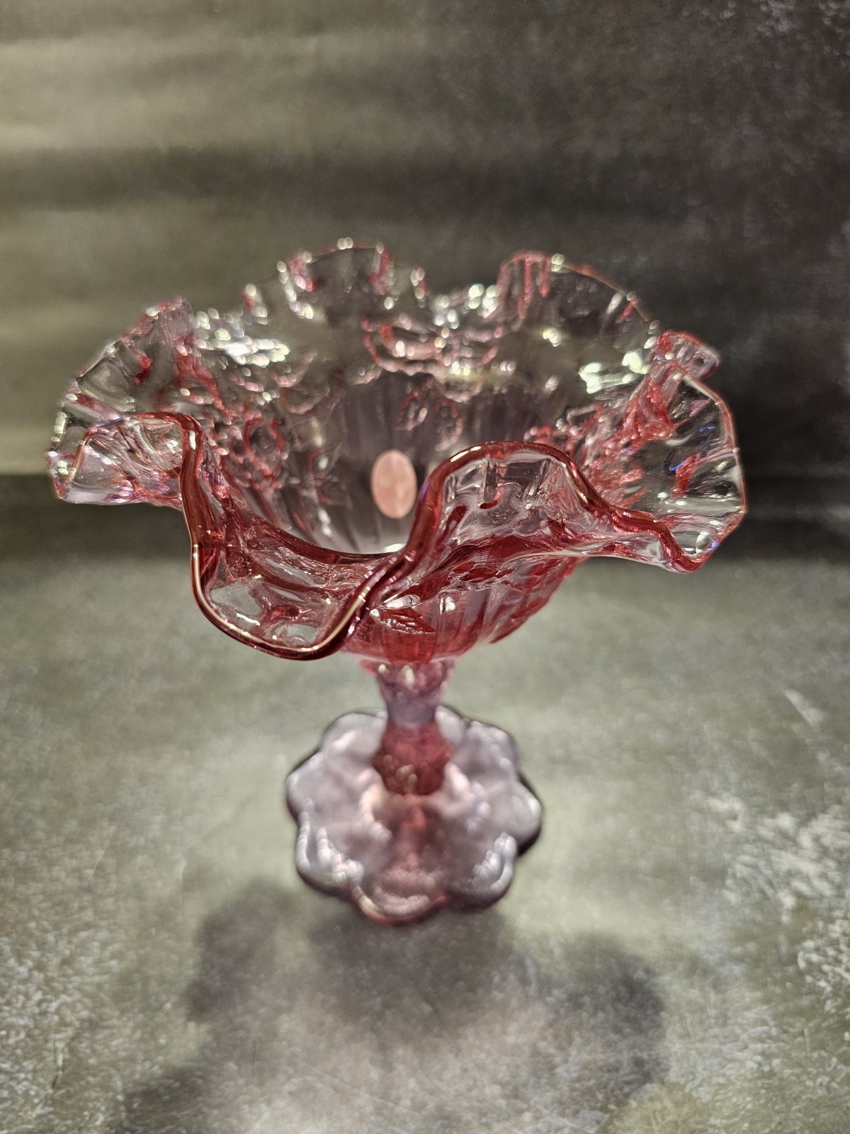 perfect condition! Experience the charm of vintage Fenton art glass with this exquisite rose pink cabbage rose ruffled pedestal compote dish. Elegantly crafted in the 1960s, this piece showcases the classic beauty of fused glass with a glossy finish that enhances its timeless appeal. Perfect as a standalone statement piece or as part of a curated collection, this compote is a testament to the enduring allure of Fenton's artful designs. The dish features a round shape with a single compartment, ideal for housing candies, small treats, or simply as a decorative element to add a touch of elegance to any room. Made in the United States, this original piece bears the distinguished mark of Fenton's craftsmanship, making it a must-have for enthusiasts and collectors alike.