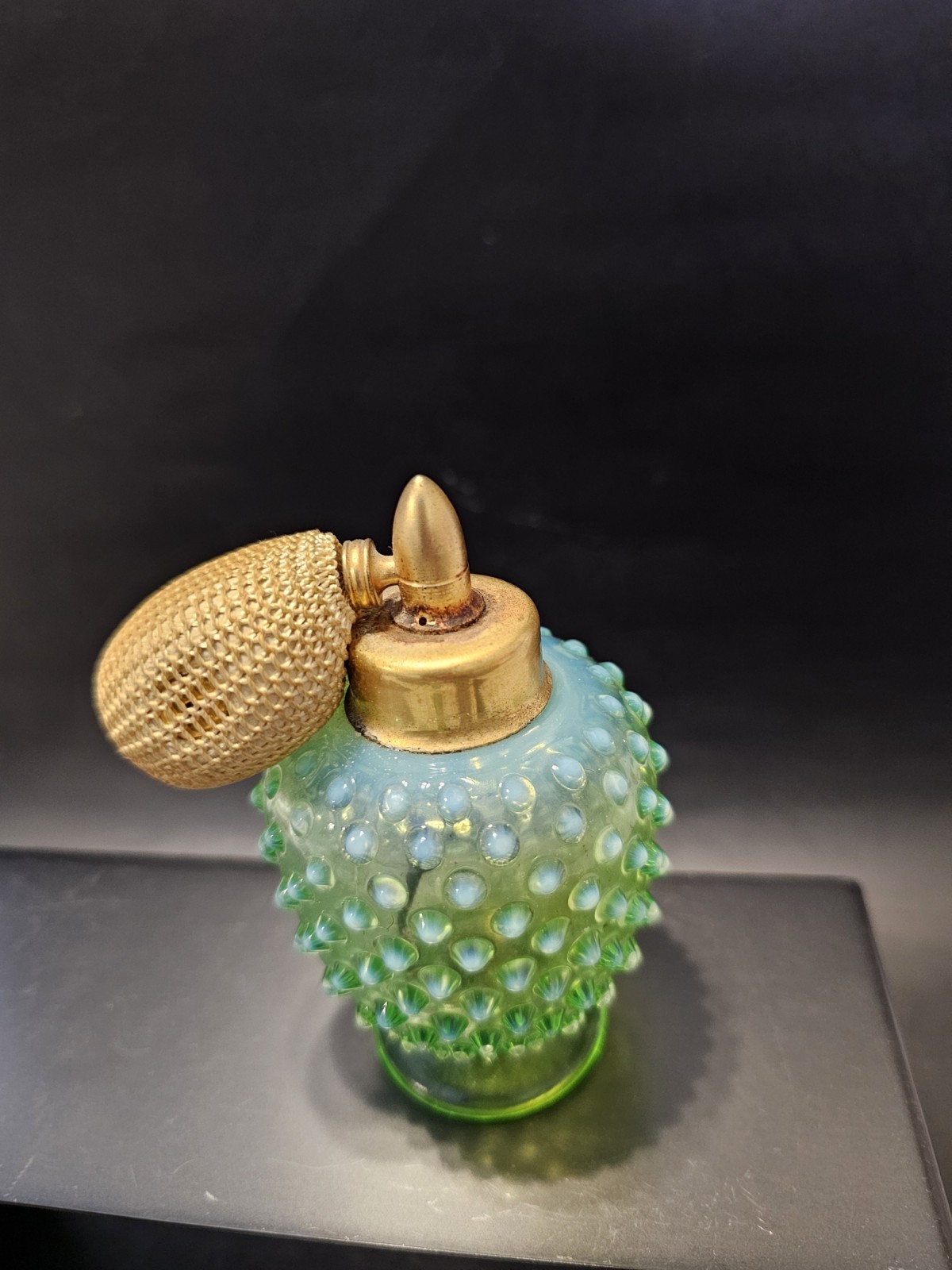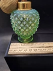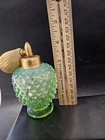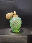 In excellent condition. Only "issue" is the bulb is hard and can't be squeezed. The product is a vintage Fenton uranium glass perfume bottle in a stunning green opalescent color with a hobnail design. This collectible piece was made in the United States and features a unique bulb shape. Perfect for collectors of vintage perfume items or those who appreciate artisan glass products, this Fenton perfume bottle exudes charm and elegance with its distinctive design and craftsmanship.