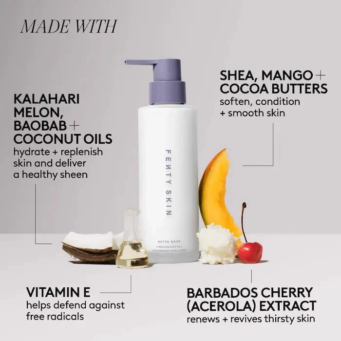 What it is: A lightweight, silky moisturizer that rapidly hydrates, sinks in quick, and has a delicious blend of butters and oils for soft, replenished skin in seconds. Skin Type: Normal, Dry, Combination, and Oily Skincare Concerns: Dryness Highlighted Ingredients: - Kalahari Melon, Baobab, and Coconut Oils: Hydrate and replenish skin and deliver a healthy sheen. - Shea, Mango, and Cocoa Butters: Visibly soften, condition, and smooth skin - Barbados Cherry Extract: Renews and revives thirsty skin. Ingredient Callouts: It is also vegan. What Else You Need to Know: This body lotion plumps skin with hydration, boosts elasticity, and supports skin’s moisture barrier. Kalahari melon, baobab, and coconut oils hydrate, replenish, and give skin a healthy-looking sheen. It features a light, fresh blend of bergamot, jasmine, and white orchid. Clinical Results: In a 1-week clinical study on 54 people, it was found to instantly: - It instantly hydrates, improves elasticity - Boosts the moisture barrier by 41% - 98% agree it leaves skin soft and supple In a 1-week clinical study on 54 people, after 1 week: - 100% agree it comforts and replenishes dry, stressed skin - 98% agree it plumps skin with hydration - 96% agree it absorbs quickly and effortlessly Ingredients -Kalahari Melon, Baobab, and Coconut Oils: Hydrate and replenish skin and deliver a healthy sheen. -Shea, Mango, and Cocoa Butters: Visibly soften, condition, and smooth skin -Barbados Cherry Extract: Renews and revives thirsty skin. Aqua/Water/Eau, Cocos Nucifera (Coconut) Oil, Cetyl Ethylhexanoate, Glycerin, Oryza Sativa (Rice) Bran Oil, Propanediol, Glyceryl Stearate Se, Adansonia Digitata Seed Oil, Citrullus Lanatus (Watermelon) Seed Oil, Theobroma Cacao (Cocoa) Seed Butter, Butyrospermum Parkii (Shea) Butter, Mangifera Indica (Mango) Seed Butter, Malpighia Punicifolia (Acerola) Fruit Extract, Tocopherol, Tocopheryl Acetate, Caprylic/Capric Triglyceride, Cetearyl Alcohol, Potassium Cetyl Phosphate, Ethylhexylglycerin, Carbomer, Sodium Hydroxide, Benzyl Salicylate, Dimethicone, Polysorbate 60, Phenoxyethanol, Parfum/Fragrance, Hexyl Cinnamal, Limonene, Linalool. The list of ingredients is subject to change. Please consult the packaging of the product purchased. How to Use Suggested Usage: -Twist the pump counter-clockwise to open. -Press down on the pump to dispense. -Apply all over body as needed. Recycling Instructions: -Its protective outer box is made of FSC material and is recyclable. FSC certification ensures that Fenty Skin boxes come from responsibly managed forests. -The pump is made from 50% PCR (post-consumer material). -The glass bottle is recyclable depending on your region; check your local guidelines.