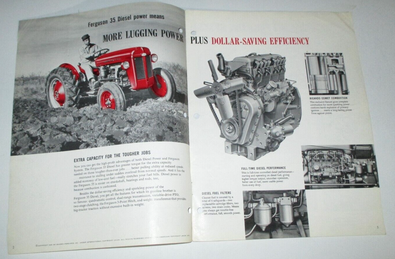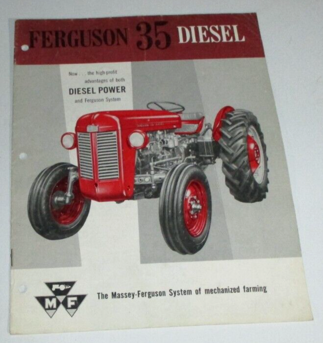 ORIGINAL! Ferguson 35 Diesel Tractor Sales Brochure. "DIESEL POWER" SEE PICTURES. Brochure no. 135 It has 12 pages. Issued/printed: 1959? Inventory No. MF-4454 OTHER SHIPPING OPTIONS ARE AVAILABLE UNDER THE "SHIPPING and PAYMENTS" TAB.** We combine shipping on same day multiple purchases if possible. Just message us for a combined invoice otherwise Ebay will automatically invoice you for full shipping charges. WE SHIP WORLD WIDE! Any package shipped to a location outside the USA, will pay higher shipping . If you are interested in Tractors & Farm or Construction Equipment, please check out my store & other auctions! International Buyers – Please Note : Import duties, taxes, and charges are not included in the item price or shipping cost. These charges are the buyer's responsibility. Please check with your country's customs office to determine what these additional costs will be prior to bidding or buying. THANKS FOR LOOKING!