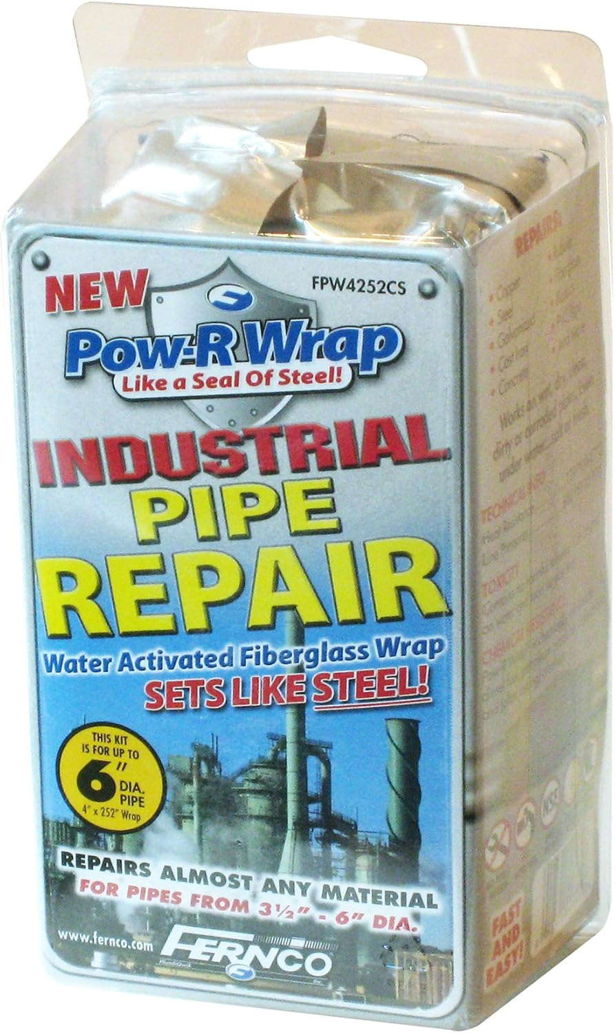 Store New Arrivals Add to Favorite View Feedback Fernco Pow-R Wrap Plumbing Pipe Leak Repair 4-In. X 252-In. Description Item model number FPW4252CS Part Number FPW4252CS Batteries Required? No Item Package Quantity 1 Color Gray Product Dimensions 252"L x 4"W Material Fiberglass Country of Origin China Global Trade Identification Number 00018578008656 Item Weight 14.4 ounces Manufacturer Fernco Batteries Included? No Coverage 1008 square inches Recommended Uses For Product repairing and reinforcing pipes and hoses Item Thickness 0.2 Inches Size FPW4252CS Is Discontinued By Manufacturer No Brand Fernco Included Components Unit^Instruction Guide Adhesives & Sealants Country of manufacture: United States Manufacturer: Fernco Product Description Pipe Repair Kit, Size 4 In. x 21 ft., Pipe Dia. 3 In. to 6 In., Color Gray, Dielectric Strength 16, 969, Compression 26, 600 PSI, Flexural Strength 16, 100 psi, Line Pressure 600 psi, Tensile Strength 24, 000 psi, Performance Temp. Range Up to 425 Degrees F, Full Cure 30 min., Standards EPA601, AS4020, Includes Fiberglass Wrap, Epoxy Putty, Gloves And Installation Instructions From the Manufacturer Established in 1964, Fernco is a global leader in manufacturing high-quality flexible pipe couplings, drainage, and plumbing systems. Renowned for exceptional performance and reliability, Fernco products are trusted by homeowners and professionals alike. With a commitment to innovation and dependability, Fernco has earned a strong reputation for delivering superior solutions. As a proud USA manufacturer, Fernco is dedicated to maintaining the highest standards of production and engineering. ABOUT US We offer the best prices around on high quality products. Our E-store includes media such as books, movies, music and games while offering electronics, toys, sporting apparel, clothing, tools, general home, garden items and more. SHIPPING We are always working hard to ensure your package arrives as soon as possible. Please understand that some factors like weather, high postal traffic, and the performance of shipping companies are outside of our control. We offer free shipping to the lower 48 states and ship within 2 business days of payment, usually sooner. We do not accept P.O. Boxes. Please provide a physical address. RETURNS We offer a 30-Day Return Policy on items which you are not completely satisfied with. You have the option for a full-refund or an exchange of the item. No returns are available on items shipped outside of the USA. PAYMENT We accept PayPal. CONTACT US This page content is yet to come Please ad us to your favorite seller and visit again later Thank You