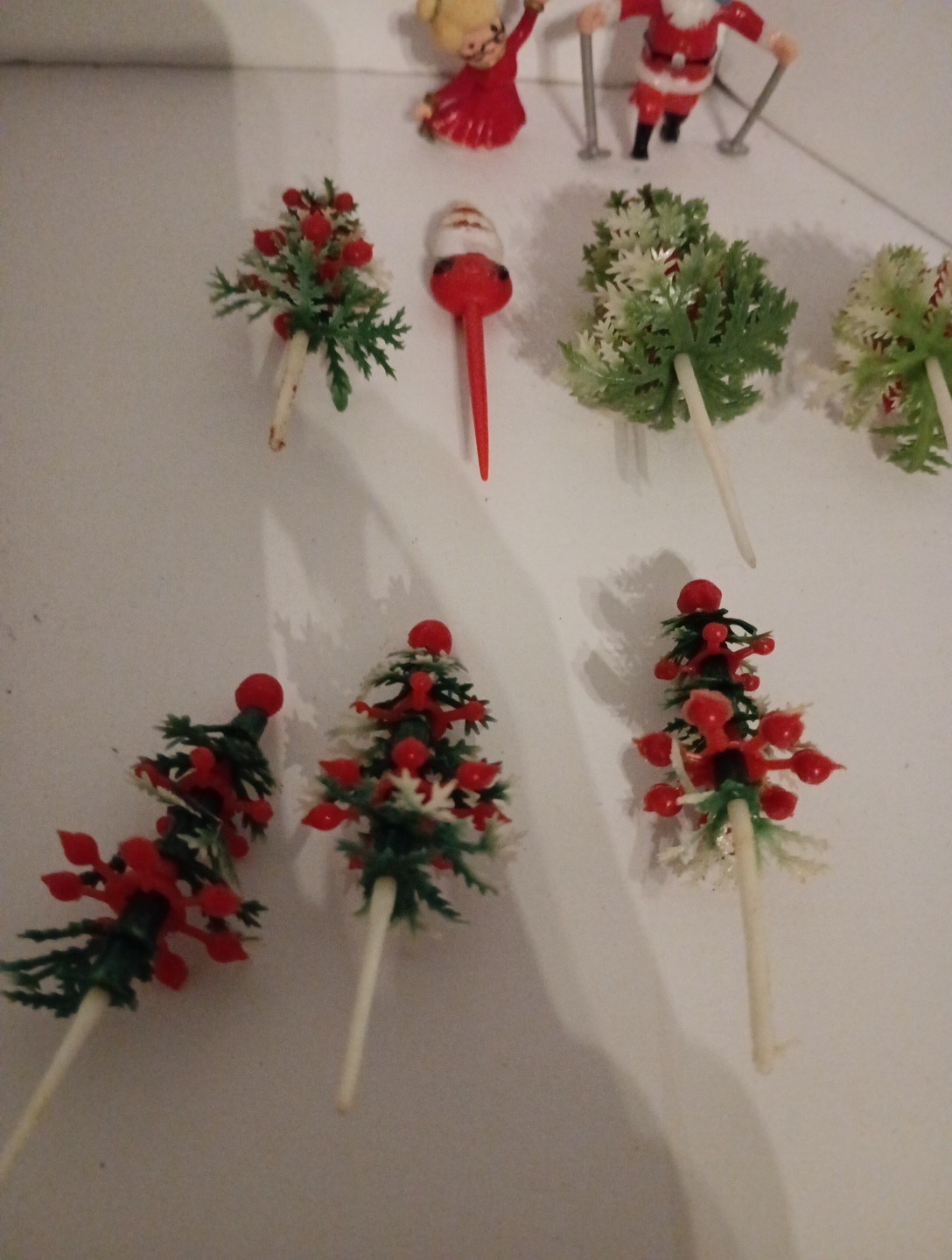 Cupcake Toppers Christmas Trees, Santa, Mrs. Claus Cake Party Picks / 9 VTG. Add some festive cheer to your holiday parties with these vintage-inspired Cupcake Toppers. Featuring a colorful array of Christmas trees, Santa Claus, and Mrs. Claus designs, these party picks are perfect for adding a touch of whimsy to your baked goods. Made from durable plastic, these picks are ideal for use year after year. Each set includes 9 colorful Cupcake Toppers, making them a great addition to any Christmas celebration. A-3