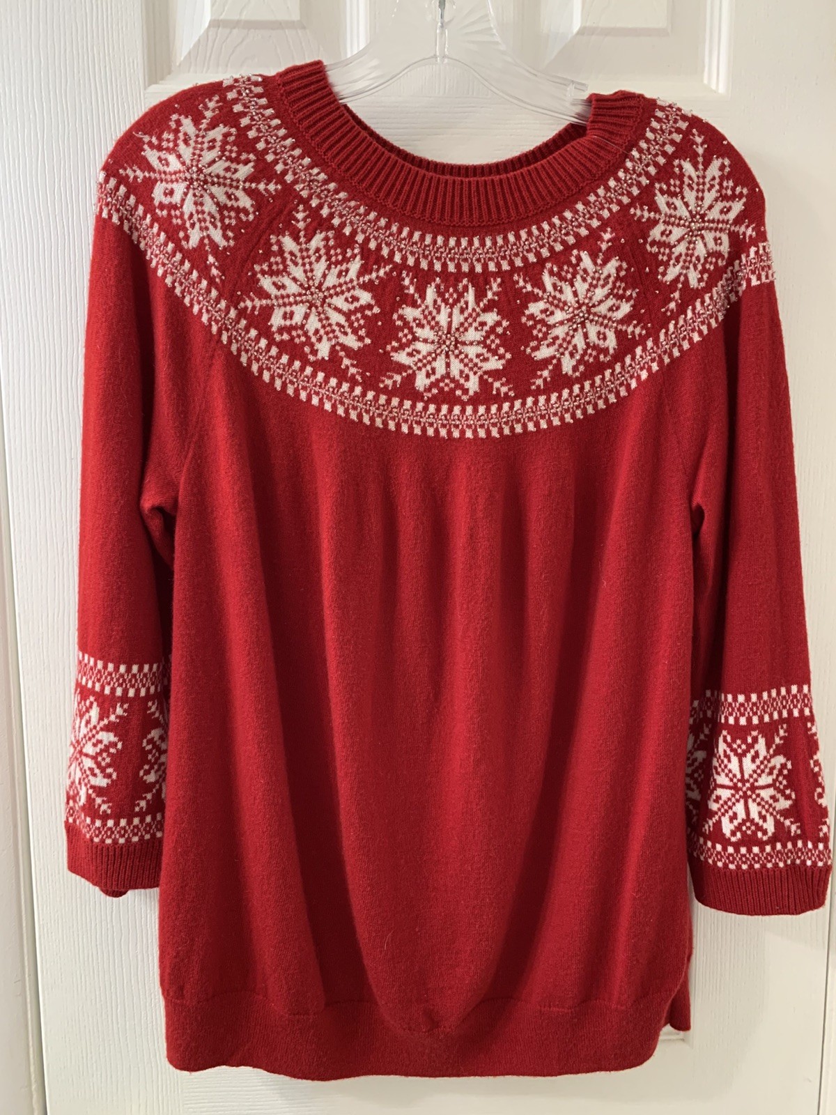 This Talbots Women's Sweater in size 1Xp is a festive and stylish addition to your winter wardrobe. Made from a blend of nylon and wool, this red sweater features a Fair Isle pattern with beaded accents, adding a touch of sparkle. The 3/4 sleeve and crew neckline make it perfect for casual occasions during the holiday season. Machine washable on delicate cycle and as a relaxed fit, this sweater is both comfortable and easy to care for, making it a practical and fashionable choice for any woman looking to stay cozy and chic.