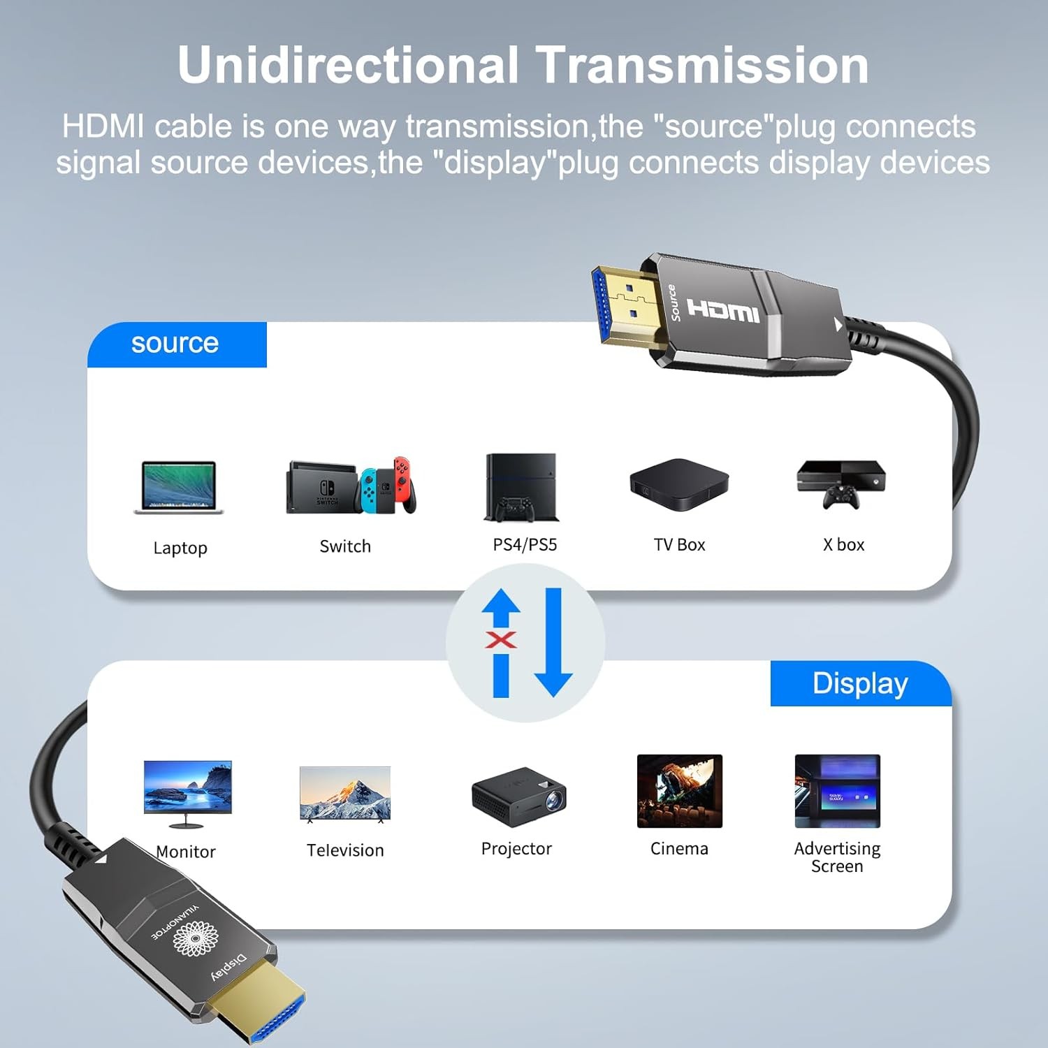 Fiber Optic HDMI Cable 50ft,8K Long 2.1 Cable,Ultra High Speed 50ft/15m Product Details Package Dimensions : 9 x 8 x 1.2 inches; 1 Pounds Manufacturer : YilianOptoe Brand: YilianOptoe Connector Type: HDMI Cable Type: HDMI Compatible Devices: Laptop, Monitor, PlayStation, Projector, Xbox Special Feature: Data Transfer, High Speed HDMI 2.1 Cable : YilianOptoe HDMI Cable made by German Chips.All of our Fiber HDMI Cables conforms to the standard HDMI 2.1 version. Backward compatible with HDMI 2.0/ 1.4/1.3/1.2/1.1. 8K HDMI Cable : HDMI cable 50ft supports high speed with 48 Gbps, 8K@60Hz, 4K@120Hz, Dynamic HDR, Dolby Vision, eARC, HDCP 2.2 and 2.3, 3D, 4:4:4 RGB, ALLM, QFT, QMS, VRR, DSC etc. Development direction of future cables. Excellent Construction : Active HDMI cable with 24K gold plated connectors and contains four fiber optic strands in an insulated pvc housing. Designed for long-distance transmission while maintaining high-speed, stable data transmission. Long Distance Lossless Transmission : Ultra-HD fiber optic hdmi cable can achieve lossless transmission. The longest transmission distance of up to 300m, reach 48Gbps. Withstands over 25,000+ bends, greatly extended use life. One-Way Transmission : The ultra high speed HDMI cable features a male-to-male connection, enabling unidirection transmission from the source to the display. The SOURCE port connects video devices such as TV boxes, PS5, PS4, Blu-ray players, Xbox Series, laptops, and more. The DISPLAY port connects display devices such as TVs, displays, projectors, monitors, and more. Ensure both ends are inserted correctly, otherwise no image will be received from the device. For Gamer Lovers : Compared to 4K HDMI cable, the 8K HDMI cable offers an improved Audio Return Channel (eARC), ensuring high-resolution sound and the highest audio quality. Our 8K HDMI cable achieves a super-smooth picture with 8K@60Hz and 4K@120Hz. The latest Game Mode supports a variable refresh rate and maximizes the performance of the graphics card and CPU for a smoother and more detailed picture.