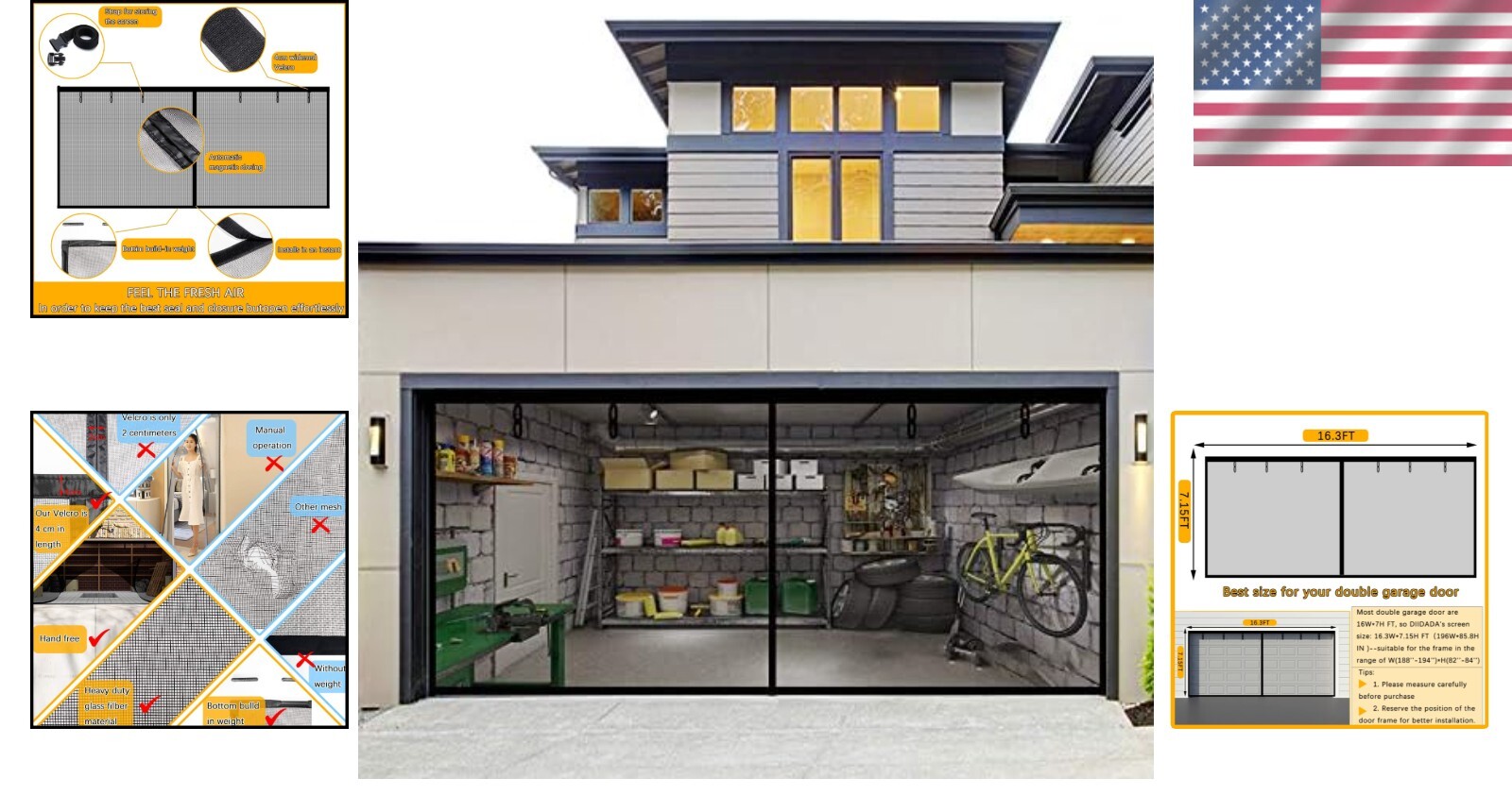 Fiberglass Magnetic Garage Screen Door 16x7ft Hands Free Mesh Roll Up for Garage ‹ › ‹ › ‹ › ‹ › ‹ › ‹ › ‹ › ‹ › Fiberglass Magnetic Garage Screen Door - 16x7ft Transform your garage into a welcoming, breezy haven with our Fiberglass Magnetic Garage Screen Door. Perfectly designed for double car garages, this hands-free mesh roll-up screen offers unmatched convenience and functionality. Features: Superior Material: Crafted from ultra-durable 16x18 fiberglass that is breathable, fireproof, and corrosion-resistant. Seamless Closure: Built with 38 strong magnetic points and enhanced with 3 additional sets of gravity sticks (6 pcs) to ensure instant closure. Perfect Fit: Designed for garage openings measuring 16x7ft, fitting door sizes up to 188"-192" x 84"-88". Effortless Installation: Install in minutes without tools, utilizing Velcro and thumbtacks for a secure fit. Hands-Free Entry: Open easily and close promptly without concerns of falling down, making it friendly for kids and pets. Optimal Ventilation: Allow natural airflow into your garage while keeping pesky bugs out, enhancing your outdoor activities. Easy Roll-Up: Equipped with 6 straps for a neat roll-up when not in use, making it frameless and easy to store. Benefits: Embrace fresh air and sunlight, creating a bright and welcoming atmosphere in your garage. Enjoy hands-free convenience as you move in and out with items in hand. Customizable installation ensures a flawless fit for your garage door frame. Sturdy construction guarantees longevity and reliability for to come. Why Choose Our Fiberglass Magnetic Garage Screen Door? Say goodbye to nuisances and welcome a new level of comfort and safety into your garage. Our screen door is not just a screen; it’s a transformative addition that enhances your living space by allowing fresh air to flow freely while keeping insects at bay. With a 100% , you can invest in this must-have accessory with confidence. Experience the ultimate fusion of convenience and elegance—order your Fiberglass Magnetic Garage Screen Door today! Shipping Free & Fast Shipping - We offer free shipping to most of the USA with a normal delivery time of 3-7 days. However, due to the current situation, additional delivery time (up to 3 weeks) may be required for some items. Alternative Carriers - We may use alternative carriers (e.g. USPS, FedEx, UPS, etc.) to ensure your package arrives safely and on time. Due to the use of multiple carriers, we are unable to provide a tracking number automatically. Handling Time - Orders are processed and shipped within 1-2 business days of receiving cleared payment. Shipping Restrictions - Shipping to Alaska, Hawaii, Puerto Rico, Guam, and other US territories may incur shipping charges or delivery restrictions. Please contact us before ordering, or your order can be refunded/cancelled. State Restrictions - There may be restrictions based on your state of purchase. For example, certain items may not be shipped to California due to state regulations. Contact for Tracking Updates - If you require tracking updates or have any concerns about the delivery of your order, please feel free to contact us, and we will be happy to assist you. Return 30-Day Hassle-Free Returns - We want you to be completely satisfied with your purchase. If you are not, you can return the item within 30 days of receiving it for a full refund or exchange. Easy Return Process - To start a return, simply contact us and we will provide you with a prepaid return shipping label and detailed instructions. Restocking Fee - There are no restocking fees for returns. However, the buyer is responsible for return shipping costs if the return is not due to a seller's error. Refund Processing Time - Refunds will be processed within 5 business days of receiving the returned item in its condition. Payment We accept all major credit cards, PayPal, and Apple Pay for your convenience. Your payment information is secure and encrypted to ensure a safe and seamless transaction. Please complete your payment within 3 days of purchase to avoid any delays in shipping. Feedback Your feedback is extremely important to us. We strive to provide the best products and customer service possible. If you are satisfied with your purchase, please take a moment to leave us a positive review. If you have any concerns or issues with your order, please contact us before leaving negative feedback. We are committed to resolving any problems and ensuring your satisfaction. Contact Us If you have any questions or concerns, please feel free to out to our customer support team. You can contact us through the eBay messaging system. We are available Monday to Friday, 9:00 am to 5:00 pm EST, and we will do our best to respond to your inquiry within 24 hours. Buy it now and enjoy a pleasant shopping experience! Model: Garage Screen Door Unit Quantity: 1 Suitable For: Garage Door,Front Entrances,Back Entrances,Terraces,Porches,Balconies Material: Fiberglass Features: Durable,Easy To Install,Self-Adhesive,Breathable,Fireproof,Corrosion Resistant,Weighted Bottom,Hands-Free Entry Color: Black Item Length: 7 ft Type: Garage Screen Door Number in Pack: 1 Item Depth: 0.5 in Item Thickness: 0.05 in Item Weight: 4.69 lb Unit Type: lb