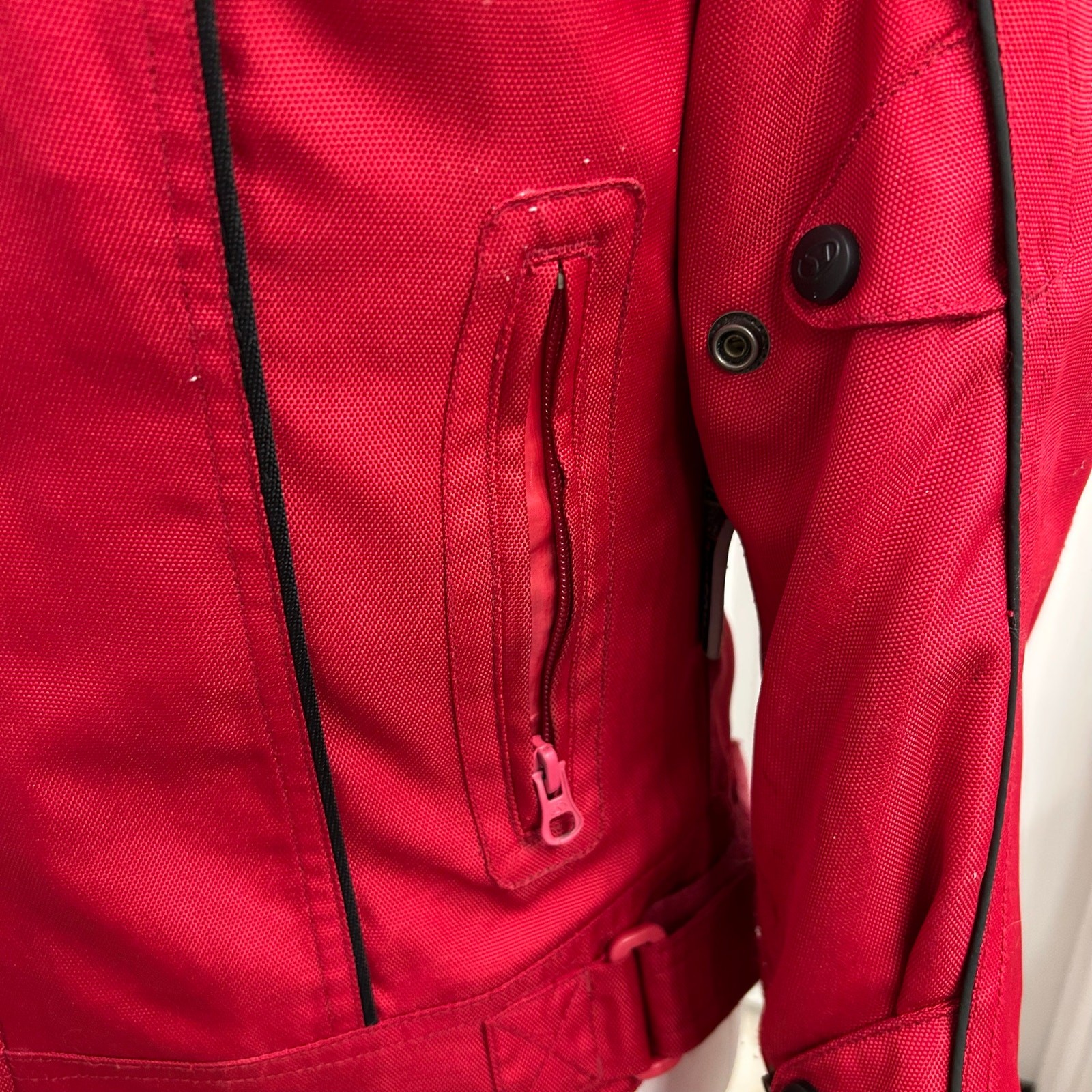 Women’s FieldSheer motorcycle riding jacket in bold red. Size 4. Includes original quilted insulated liner for added warmth. Features abrasion-resistant textile construction, adjustable fit points, zippered vents, and FS branding. Features: • Brand: FieldSheer (FS) • Size: 4 (Women’s) • Color: Red • Removable quilted insulated liner • Zippered pockets • Adjustable waist straps + arm snaps • Protective reinforced textile shell • FS badge on back + FS logo on shoulder • Comfortable touring/sport cut Good preowned condition with normal light wear. Perfect for commuting, weekend riding, or anyone needing lightweight but protective moto gear.