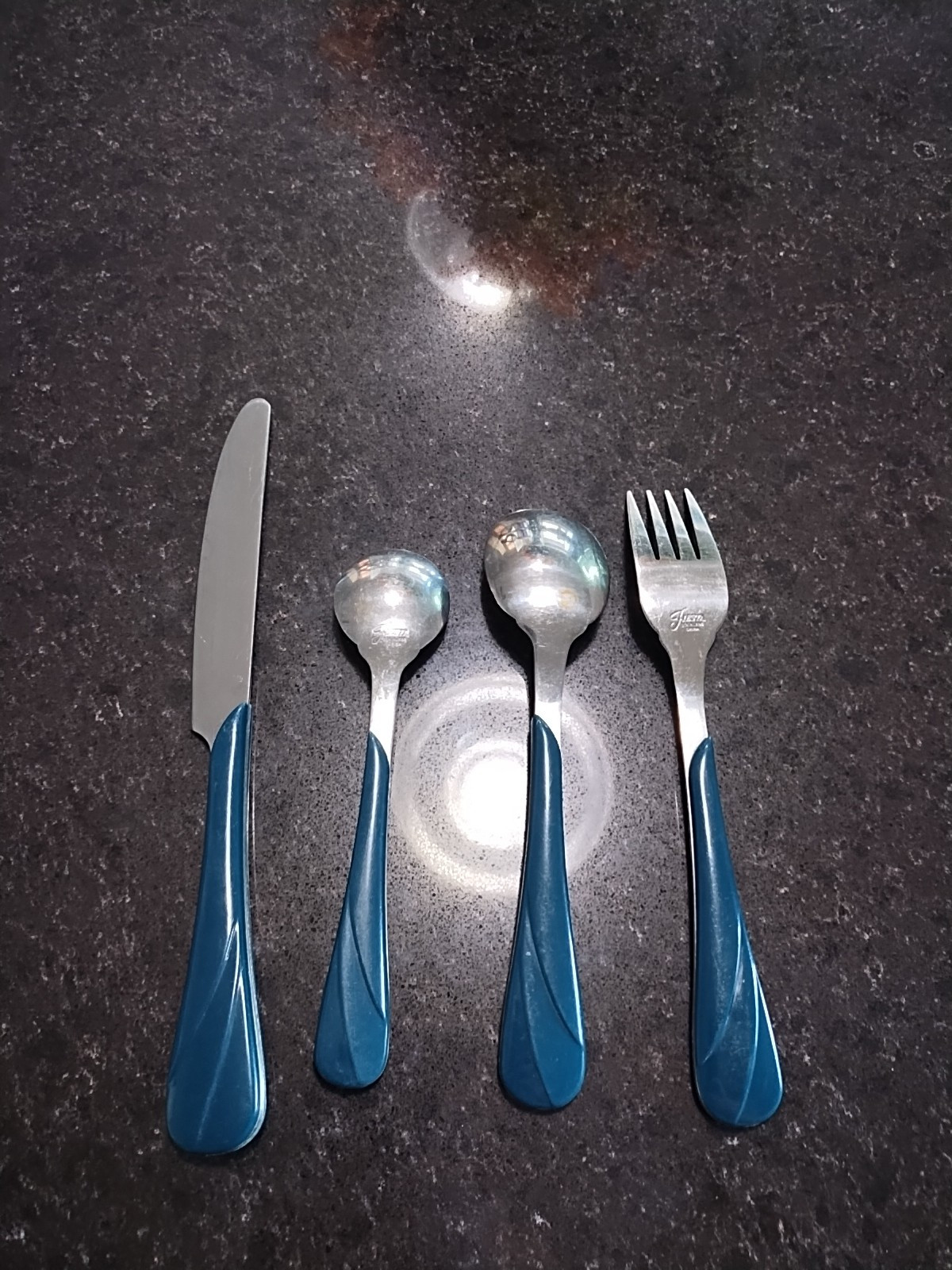 This is a Fiesta Juniper Swirl 4-Piece Flatware Silverware Set that includes a fork, two spoons and knife. The set is made of stainless steel with plastic handles in a contemporary style. It is an original Fiesta product manufactured in China during the 1990s, suitable for adults in an American culture. The flatware set features a solid handle pattern and is part of the Folks, Knife And Spoon type.