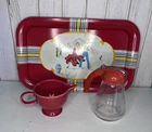 Add a splash of vintage charm to your dining table with this Fiesta Scarlet Creamer Lot. The set includes a contemporary Fiesta sugar bowl with a red Mexican tray for easy serving. Additionally, this lot features a 1950s Canadian syrup dispenser, adding a unique touch to your collection. Crafted from ceramic in a vibrant red hue, this set is sure to impress your guests and elevate your dining experience. Made in the United States and Canada this collection is a must-have for any kitchenware enthusiast.