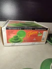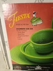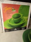 This Fiestaware Shamrock 5 Piece Place Setting is a rare find for collectors and those who appreciate unique dinnerware. The set includes a saucer, soup bowl, salad plate, dinner plate, and cup, all in a beautiful green color with an Art Deco style. The set is handmade and produced using pottery techniques, making each piece one-of-a-kind. This Fiesta Shamrock set is perfect for special occasions, such as retirement parties or dinner parties. The set is in excellent used condition and has been well-maintained. Don't miss out on adding this rare and beautiful set to your collection or using it to impress your guests.