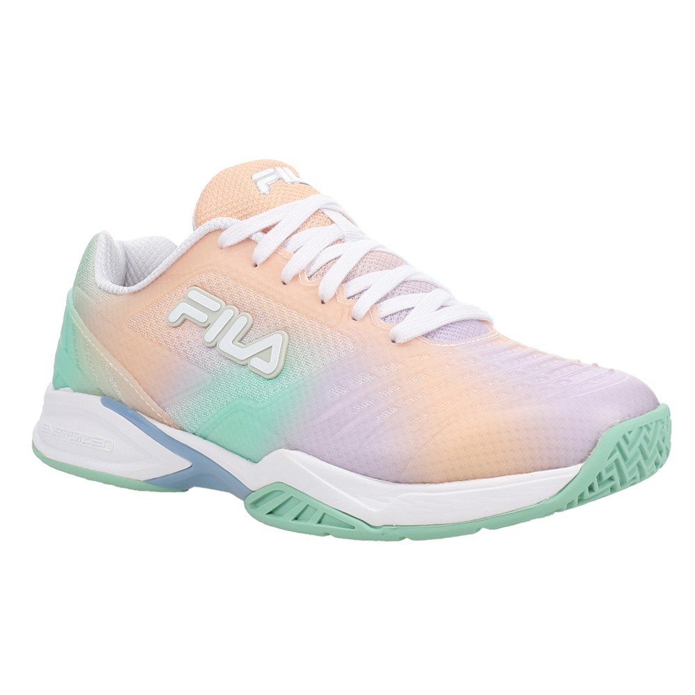 Axilus 2 Energized Tennis Shoes Product Details Lightweight, breathable mesh and synthetic upper with molded forefoot cage for support Molded Heel Cup and Molded breathable sockliner Energized rubber cushioning in the heel and forefoot TPU Midfoot Stabilizer for lightweight, responsive cushioning Durable rubber outsole for traction on all court surfaces Color: Acrm/Mult/Wht Designed for top notch performance on the court, this shoe offers a perfect blend of lightness and stability in a flexible package, catering to tennis players of all skill levels. The breathable mesh upper is equipped with a molded forefoot cage that provides lightweight support, while the Energized rubber cushioning and TPU midfoot stabilizer offer responsive cushioning to make this tennis shoe exceptionally comfortable. Additional Details Manufacturer Color: Acrm/Mult/Wht Color: Orange, Purple Occasion: Casual Gender: Womens Age: Adult Brand: Fila