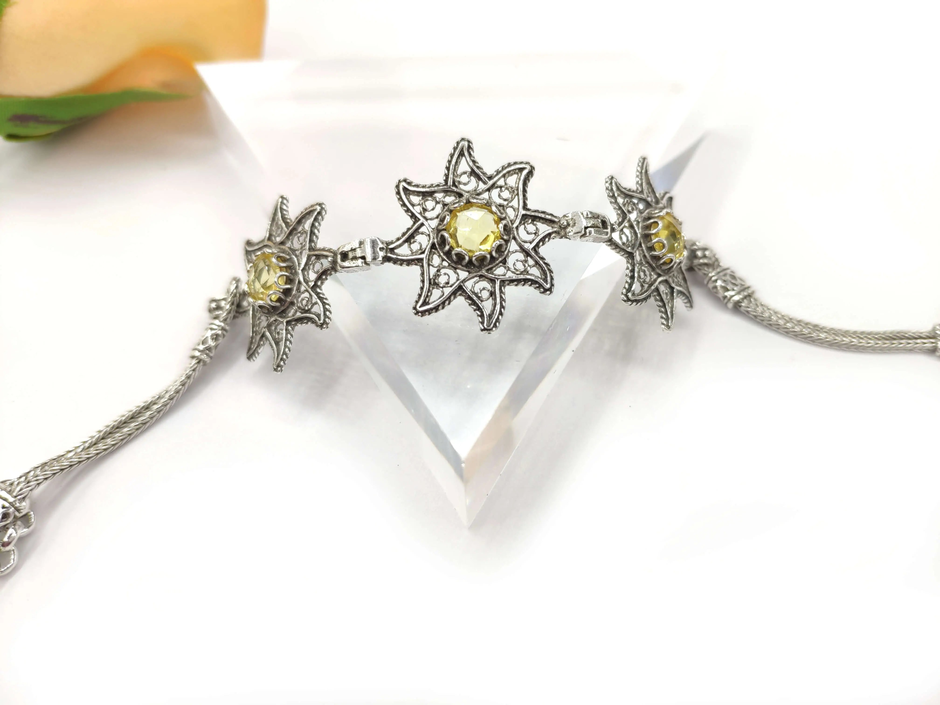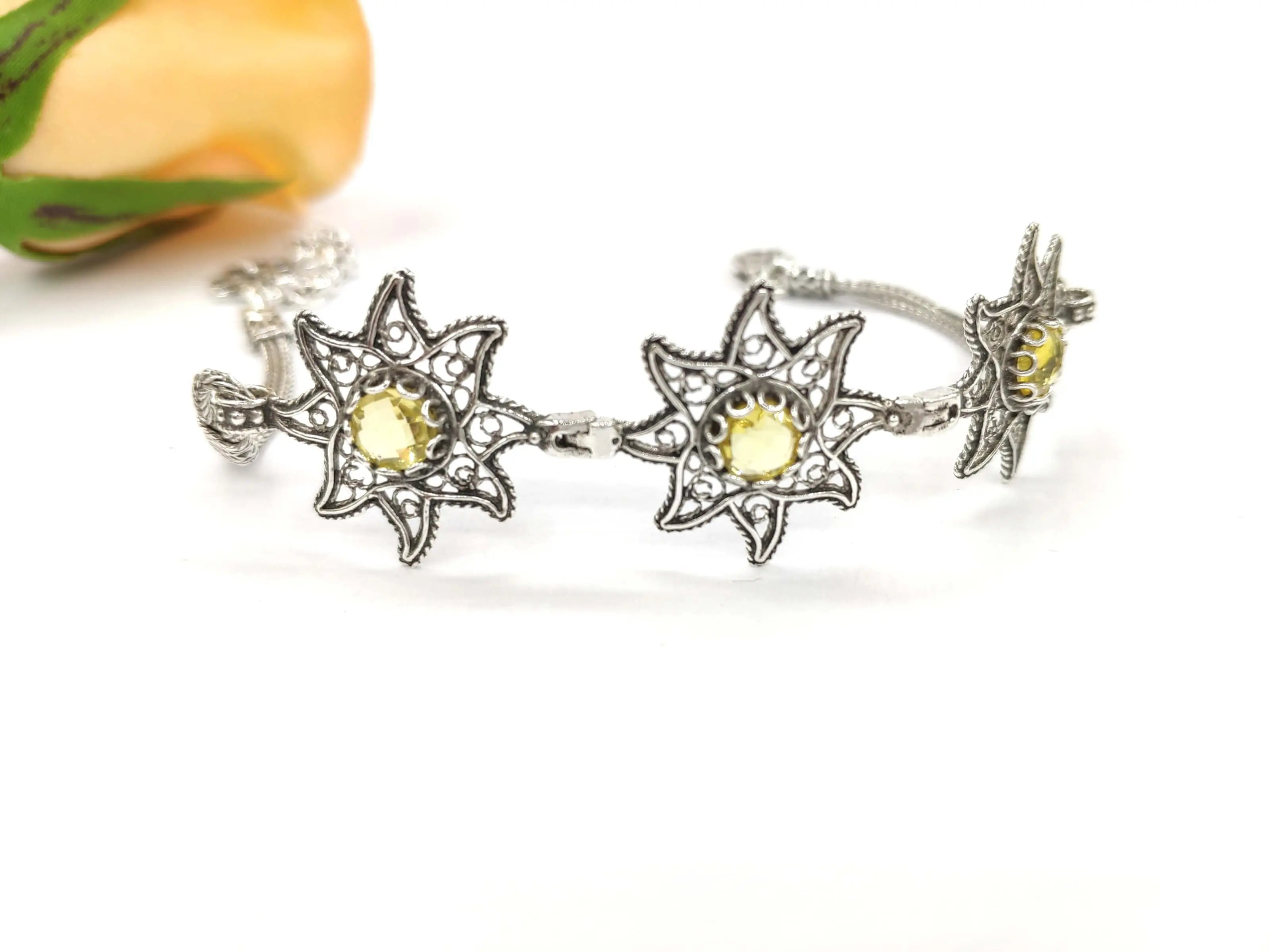 Add a touch of sunny elegance to your outfit with this stunning 925 sterling silver handmade filigree art star design citrine gemstone women's adjustable link bracelet. With a length of 7.00 inches and a 2.00 inches extension, this bracelet is adjustable to fit any wrist size. Each 6.00 mm round cut citrine gemstone sparkles in the light, perfectly complementing the intricate silver filigree work. Citrine is the November birthstone, making this bracelet a meaningful gift for those born in that month or for any special occasion, such as anniversaries, birthdays or thanksgiving. The bracelet comes with a silver polish cloth to keep it looking its best and a luxurious gift box, making it ready for giving. This bracelet is sure to become a cherished addition to your jewelry collection or a cherished gift for someone special. Order now and experience the beauty of this stunning citrine gemstone bracelet!