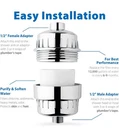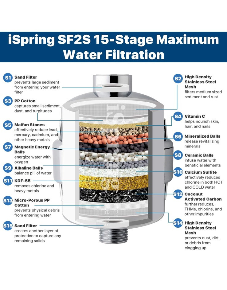 Material High Density Stainless Steel, PP Cotton Item Weight 354 Grams External Testing Certification NO Product Benefits Removes chlorine, sediment, and water-soluble heavy metals from shower water, nurturing elements such as Vitamin C, improving skin, hair, nails' healthRemoves chlorine, sediment, and water-soluble heavy metals from shower water, nurturing elements such as… See more Brand iSpring UPC 810004171619 [Maximum 15-Stage Filtration Capacity] Featuring a scientifically formulated process of 12 different filtration media in 15 stages, iSpring SF series shower filters quickly remove up to 99% of chlorine, sediment, hydrogen sulfide, water-soluble heavy metals. Water quality is further improved by nurturing elements such as Vitamin C being released and added back to your shower water. [Less Cost, Longer Life, Better Results] Less than a dime a day, iSpring shower filters last longer(6-9 months) than most shower filters on the market. SF2S fights eczema, irritation, itchiness or dryness, leaving you noticeably smoother skin, softer hair, and stronger nails. A simple and inexpensive step towards a healthy life. Note: This shower filter is designed to be used exclusively with the FSF2 replacement filter and should not be used with any other shower filter models. [Easy Installation and Consistent Water Pressure] Its unique Never Clog design copes with hard water and prohibits limescale buildup. Tool free design makes installation and cartridge replacement a breeze. Little impact on water pressure. In case source water has high levels of sediment common with well water, once a while simply flip the filter cartridge over and flush it with hot water to remove sediment built-up, then set it back in its original position. [One Size Fits All] This stylish filter fits every standard ½” shower. Works beautifully with fixed, handheld, or rain shower heads. A must-have to protect yourself and your family from inhaling, absorbing, or consuming dangerous chemicals and pathogens during each shower.