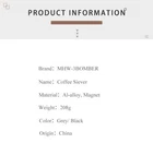 Product Details *5 in 1 Coffee Sieve:This coffee sifter is equipped with five sizes of filters: 1mm, 0.08mm, 0.06mm, 0.05mm, 0.04mm, meets all your coffee powder coarse and fine needs, let you enjoy different flavour of coffee. *Detachable Design:This coffee sifter can be detachable into 4 parts: the lid, the powder container, the filter and the fine powder bowl, so cleaning gets easier and the filter replacement gets more casual. *Premium Material:MHW-3BOMBER 5 in 1 coffee sifter is made of food grade aluminum alloy and high quality magnet, sturdy and durable, safe and reliable.