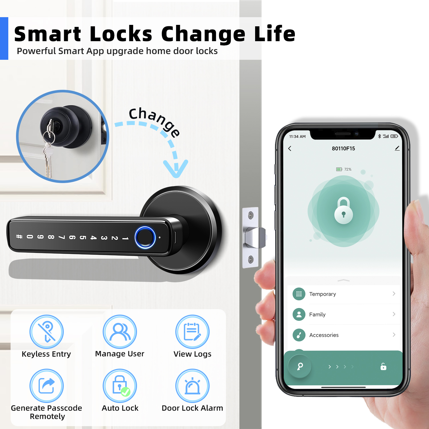 This smart door lock offers a convenient and secure 4-in-1 keyless entry with fingerprint, Tuya app, password, and physical keys. Featuring an upgraded 360° live fingerprint sensor with 99% accuracy and 0.3-second unlock time, the lock also supports app control for fingerprint management, unlock history, auto-lock, and passage mode. Combining a classical door knob design with modern smart features, this lock is easy to install and fits most US doors, providing a seamless and secure solution for your home or office. 【4-IN-1 Unlock Ways】 Volibel smart lock has 4-in-1 keyless entry door lock: fingerprint +Tuya APP Bluetooth +password + 2 physical key. We have increased the storage space of lock, stores up to 50 fingerprints and 100 password codes. The elderly and children can easily use, free entry and exit. Eliminating the trouble of carrying key with you. 【Upgraded Fingerprint Sensor】: The fingerprint door lock in black is equipped with upgraded 360° live fingerprint, and the recognition accuracy rate is up to 99%, one touch unlocks in just 0.3second, and the upgraded fingerprint reader will be more durable, stable and accurate. Buy Volibel smart lock to make your home more secure and convenient, worth choosing. 【Simple but Smarter and Securer】 The biometric door lock support App control, easily get fingerprint manage, app check unlocks records, auto lock, passage mode, secure lock, help you create a smarter and much convenient life, guard your family safety. 【Classical Design but Stronger】 The biometric door smart deadbolt extended the classical door knob design, equipped with fingerprint lock function and modern App control, a very ideal fingerprint doorknob smart lock for bedroom door, office, apartments, hotels. 【Easy Installation】 The fingerprint door knob door lock can be easily installed with a screwdriver within minutes, fits most US door, easily replace with existing door locks. Unlocking method: fingerprint unlocking, password unlocking, Tuya APP unlocking; Fingerprint password lock when fingerprint or password is not registered.The device will not turn on the Bluetooth network configuration mode.Before connecting the Tuya APP, you need to press the fingerprint or password first, then the device wakes up and turns on the network configuration mode for 1 minute;After the lock body is restored to factory settings,all data in the device will be cleared; Password: if there are 10 digital keys (0-9)for the touch code of the machine, the number of digits of the user password is 6-12 digits; The dynamic password generated by the APP has 6-12 digits,and the user can directly enter it at the lock end to unlock;