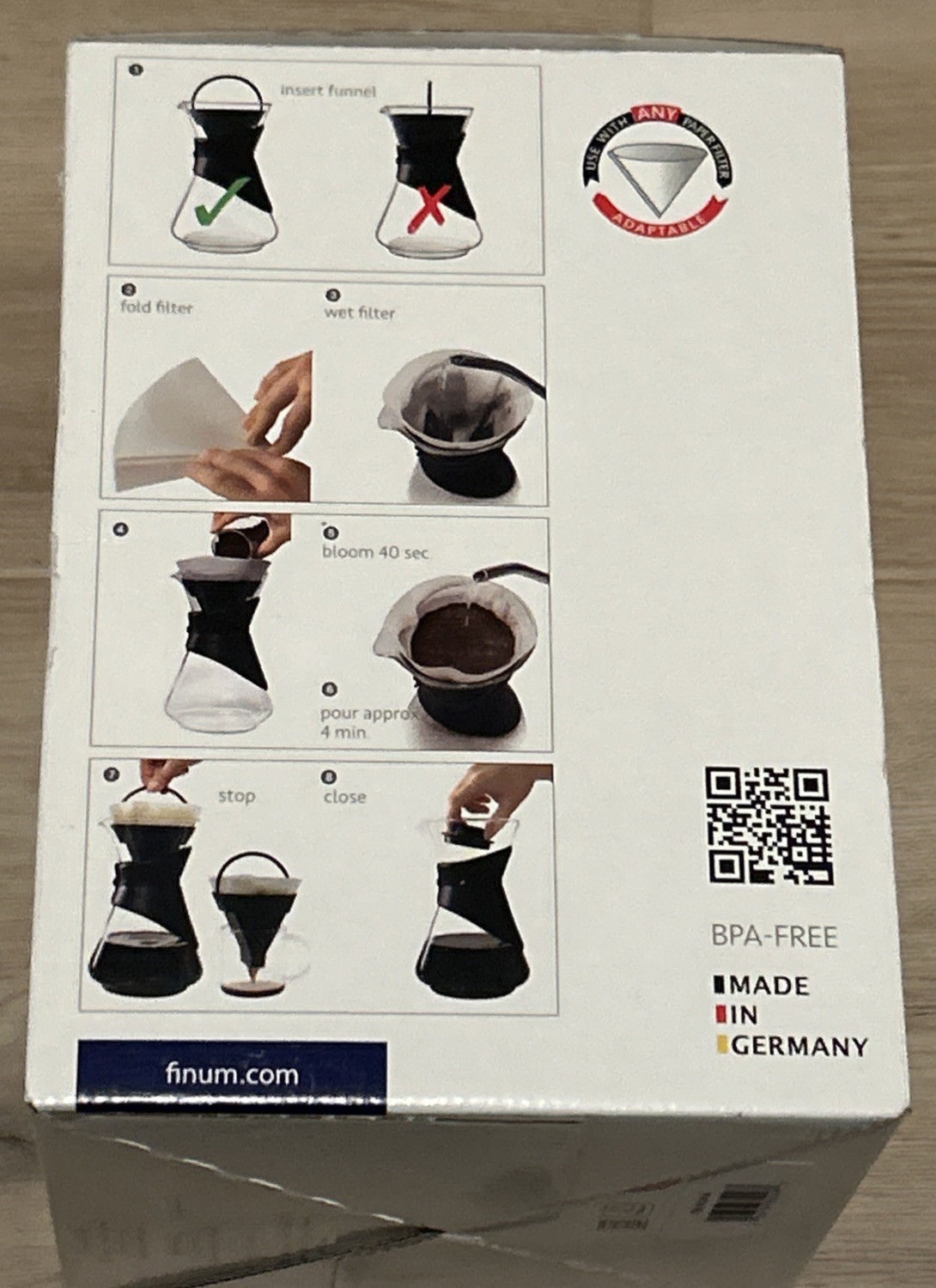 The Finum Bloom and Flow™ Pour-Over Coffee Brewer is a high-quality coffee maker designed and manufactured in Germany. This sleek and modern brewer is perfect for coffee enthusiasts who enjoy the art of brewing their own coffee. With a capacity to brew up to 5 cups of ground coffee, this model features a height of 9 inches and a depth of 6 inches, making it a compact and suitable addition to any kitchen. The included coffee filters ensure a clean and flavorful cup of coffee every time. The Bloom and Flow™ Pour-Over Coffee Brewer promises a smooth and enjoyable brewing experience for coffee lovers.