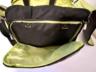 This gently used spacious Fisher-Price Fastfinder Deluxe Diaper Bag is a must-have for all parents. It comes in a stylish black and green color, perfect for both moms and dads. The bag is made of heavy-duty nylon material that is water-resistant. It features numerous sections, inner pockets, outer pockets, and inner dividers to keep all your baby's essentials organized. The bag also comes with a cross-body strap that is adjustable for your comfort. This messenger-style bag is perfect for on-the-go parents who need to carry all of their baby's items with them. Get your hands on this high-quality diaper bag now!