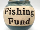 The "Fishing Fund North Carolina Tumbleweed Pottery Ceramic Savings Jar Bank" is a unique jar made by Tumbleweed Pottery in North Carolina. This decorative jar features a fish theme in multicolor ceramic, perfect for saving money or storing small items. With a lid included, this art pottery piece showcases traditional pottery techniques and is proudly made in the United States. Ideal for those who appreciate handcrafted, one-of-a-kind pieces, this jar adds a touch of charm to any space.