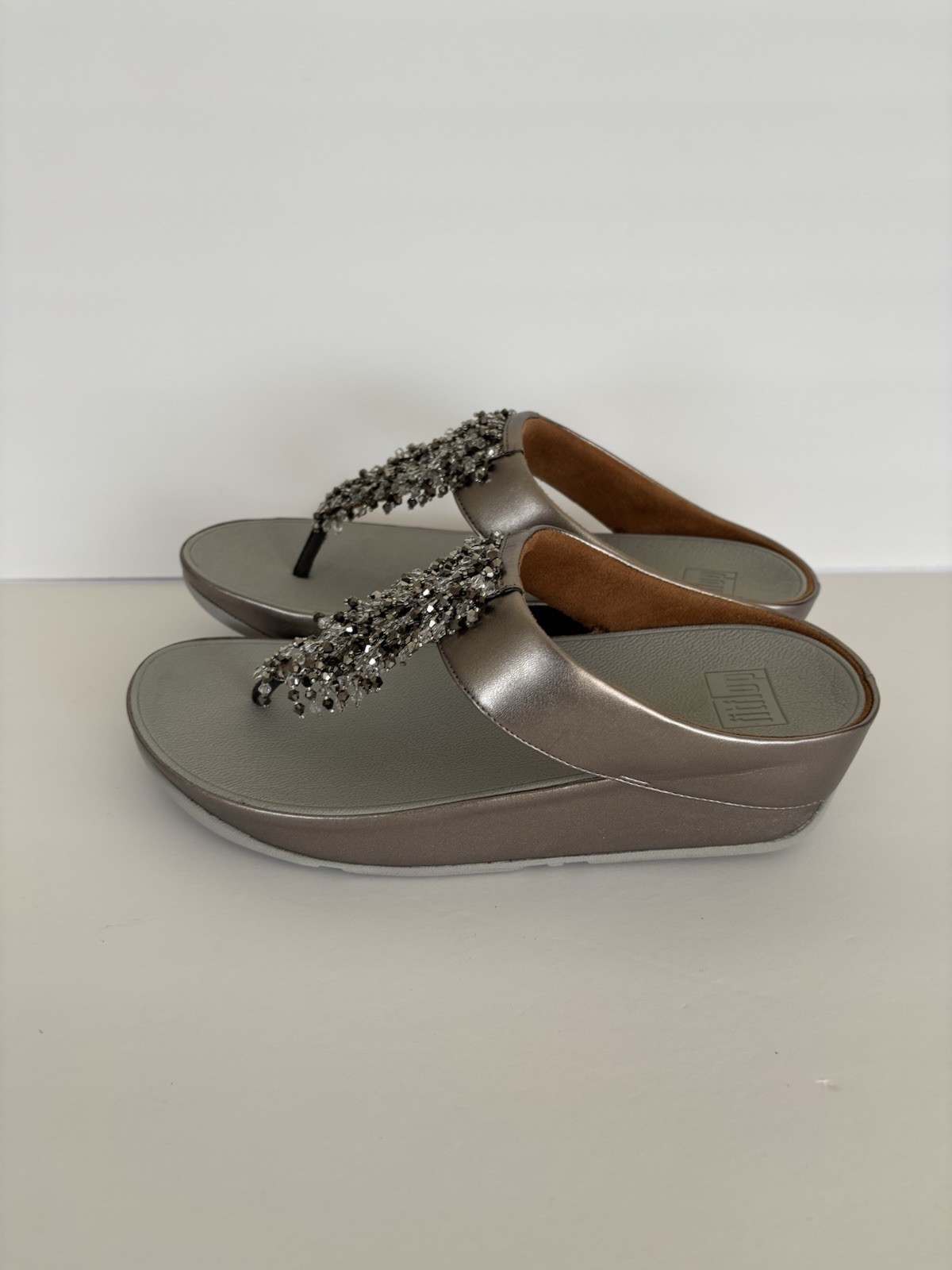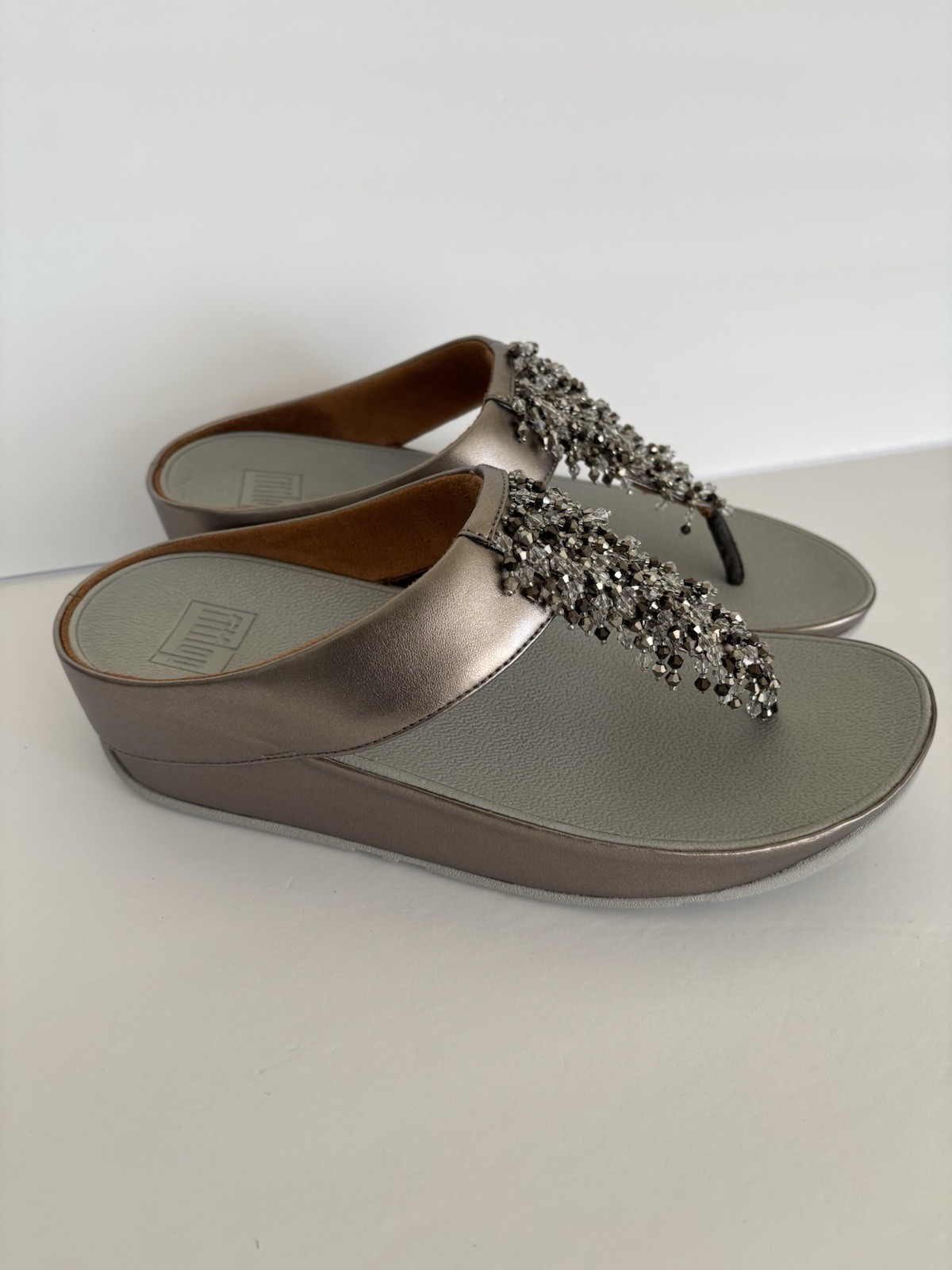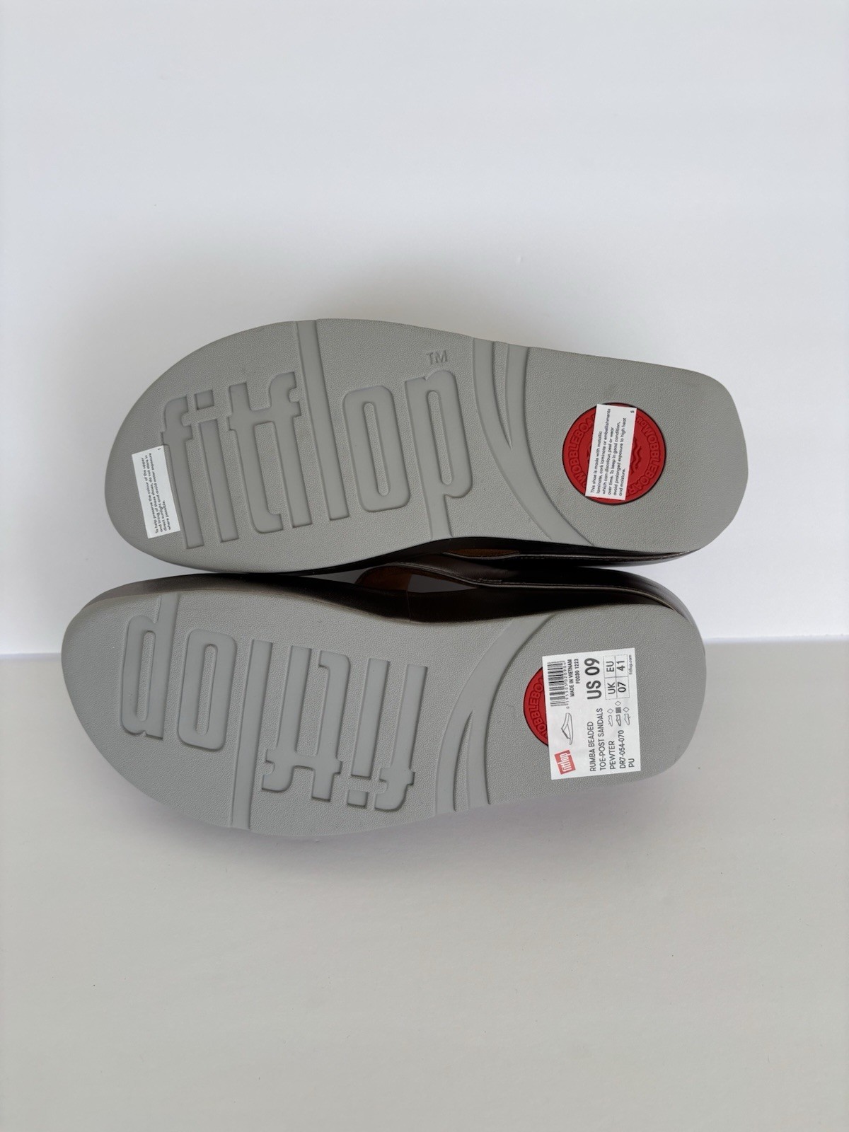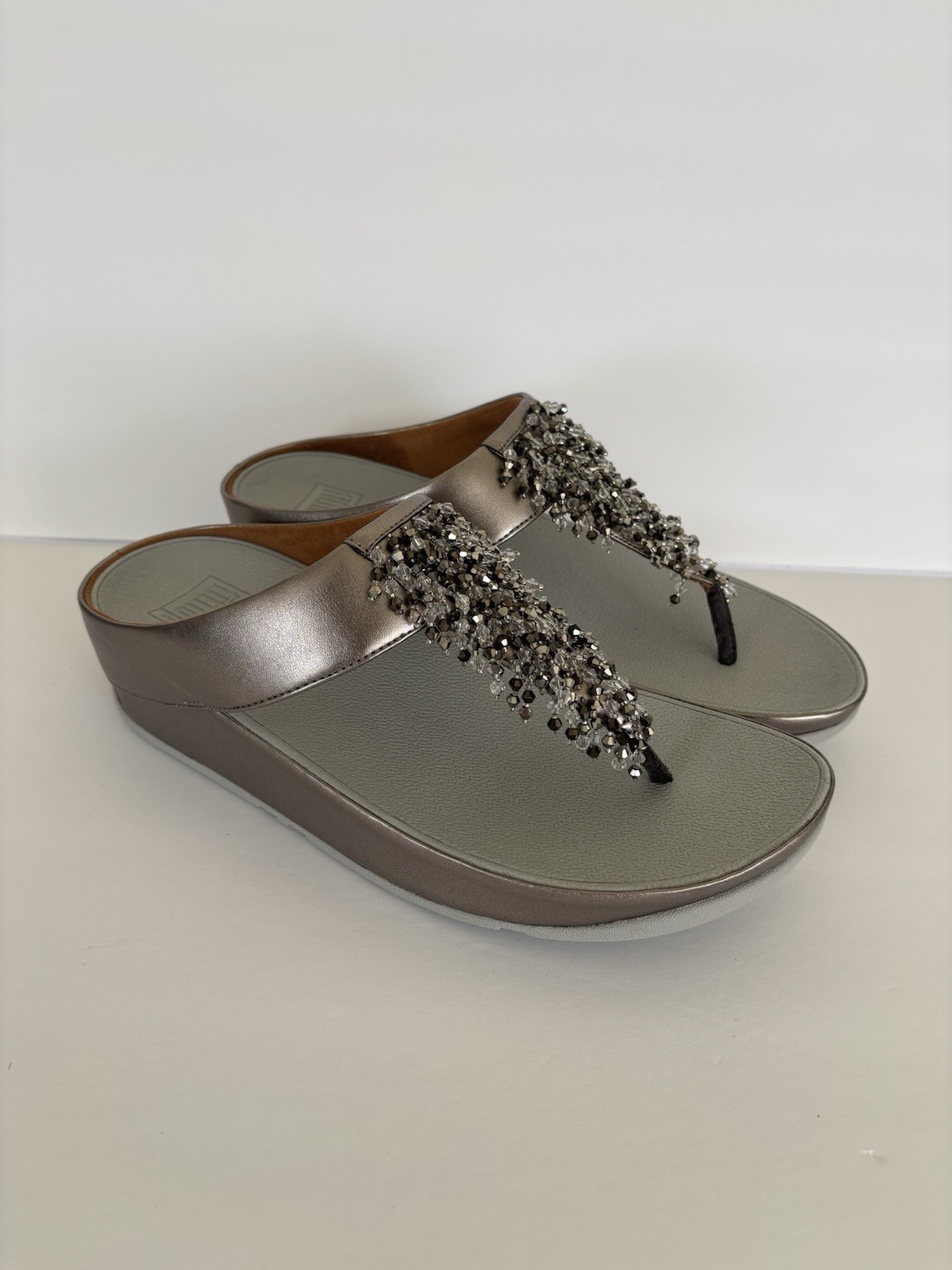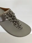 FitFlop Sandal RUMBA Beaded Metallic-size 9 pewter Color BRAND NEW without box SHIPS OUT WITHIN 24hrs!! The FitFlop Rumba Sandal in pewter color, size 9, is a stylish and comfortable slip-on sandal with a low wedge heel. The beaded metallic accents add a touch of sparkle to the gray silver color, perfect for a variety of themes including Barbie, Mermaid, Fairy, and Cinderella. The shoe features arch support, cushioning, slip resistance, and a comfortable fit, making it a versatile option for women looking for a chic and practical sandal for everyday wear.