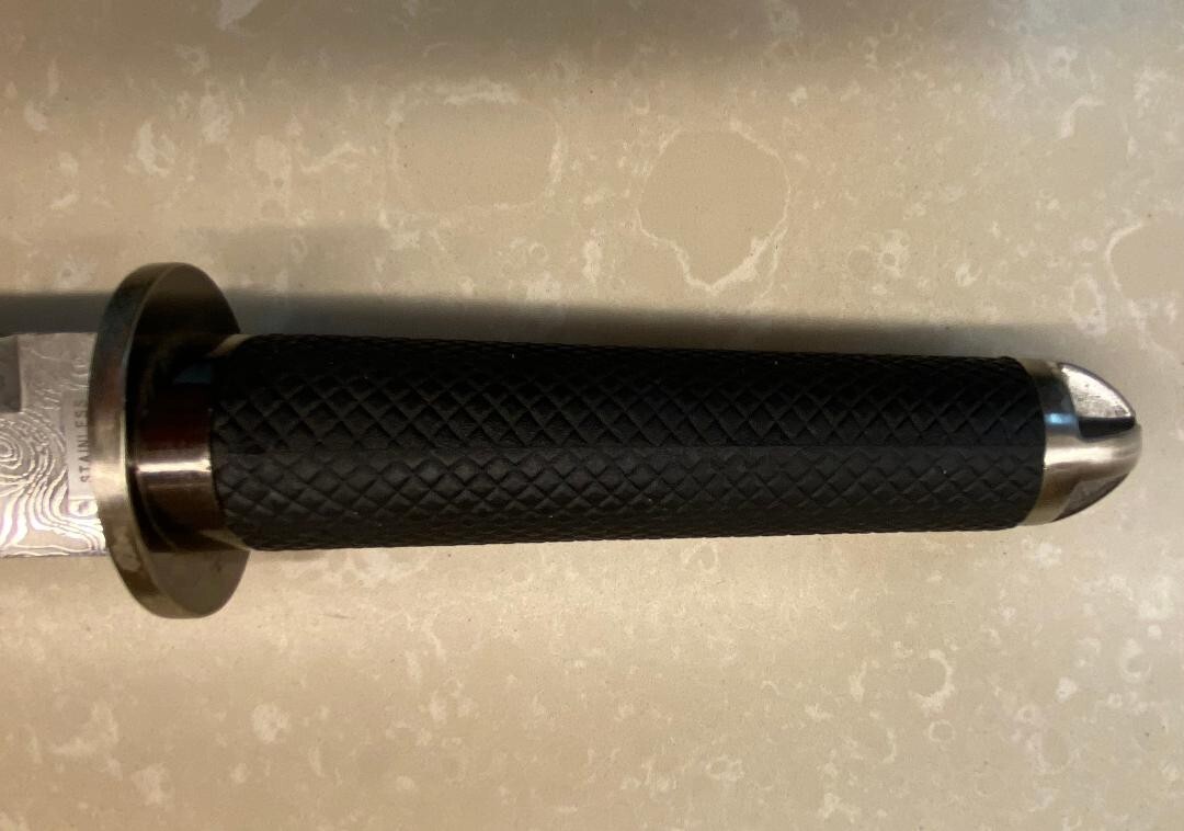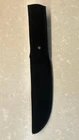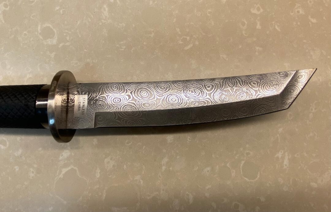This fixed tanto blade stainless knife is in fantastic condition. The blade has the original edge and appears to have never been used. The etched pattern on the blade is similar to a raindrop Damascus pattern. The handle screws off and is hollow with a steel dowel insert. This is a heavy, well-made knife weighing 1 lb. 5 oz. The belt sheath is in very good condition with a very small amount of rust on the snap. Please see the photos to appreciate the overall nice condition. Thanks for taking a look.