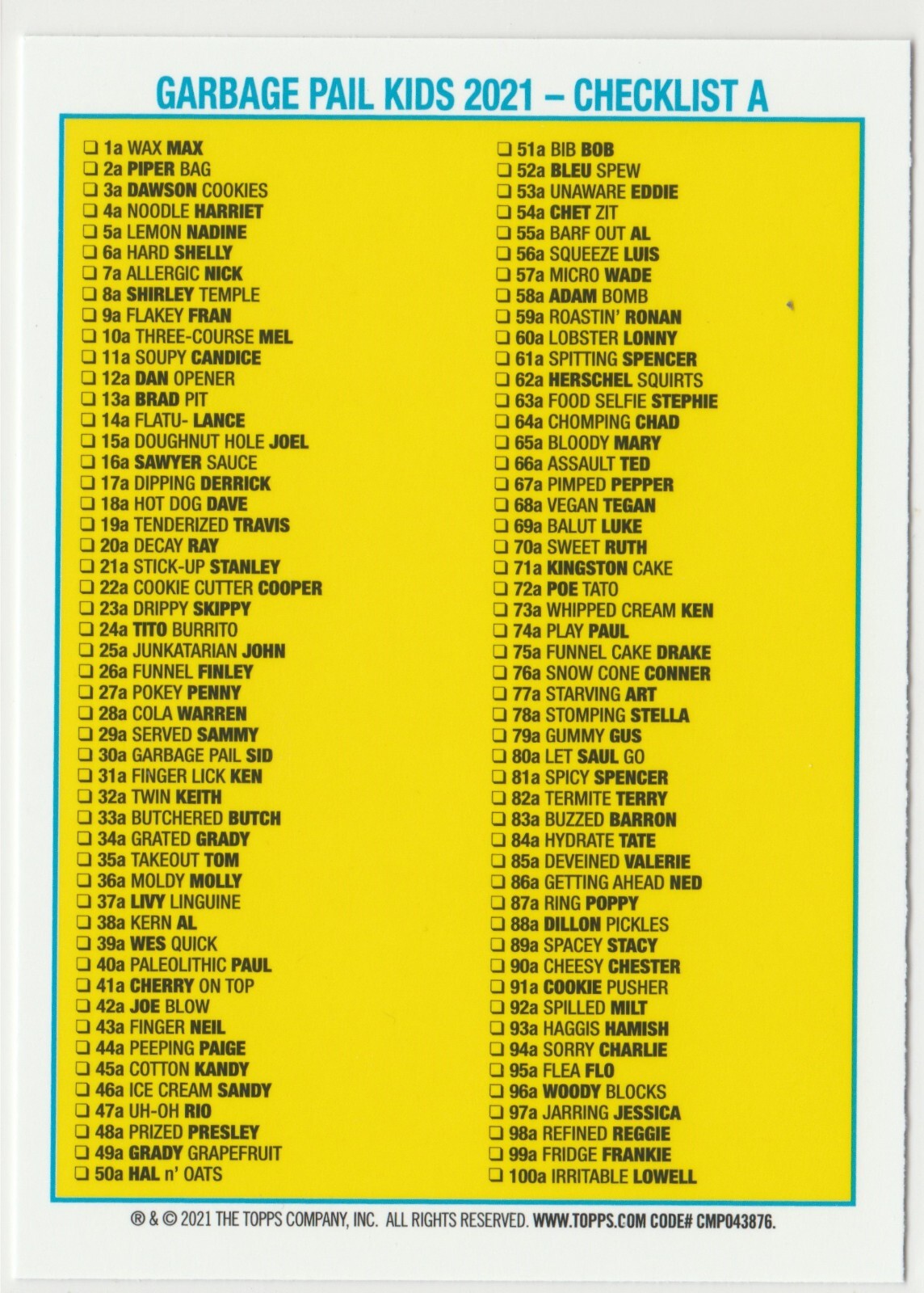 Franchise: Garbage Pail Kids Type: Non-Sport Trading Card Country/Region of Manufacture: United States Original/Licensed Reprint: Original Manufacturer: Topps Language: English Vintage: No Features: Base Set, Sticker Material: Card Stock Card Size: Standard Set: Food Fight Genre: Comedy, Parody, Satire Year Manufactured: 2021