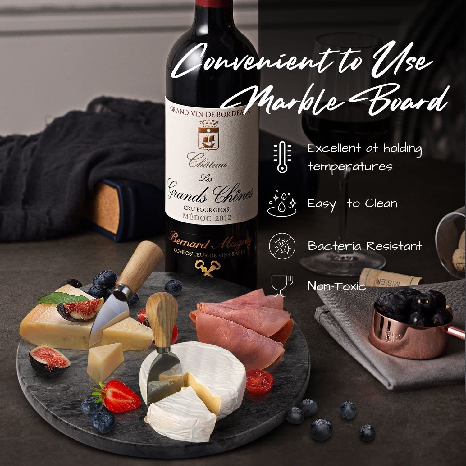 Serve your sweet and savory choice with our charcuterie board, and achieve an effortless presentation that brings everything together. Typically, a charcuterie board includes a variety of cured meats and cheeses, such as salami, prosciutto, Brie, and Gouda, in addition to additional small bites like hummus, jam, bread, honey, fruit, and edible flowers. The wonderful thing about a platter of ready-to-eat finger foods is that you can put one together without needing a lot of culinary expertise. However, it can take some experience to get the presentation just right. With our marble charcuterie board, you can show friends and family your charcuterie with a mouth-watering display and a touch of class. Each cheese board marble has a unique design because of the natural grains of marble, making each piece one-of-a-kind. The simple and beautiful design will look great on your table, coffee table, or countertop. This marble pastry board is easy to clean. When finished, you can wipe it with a damp towel or hand wash it with soap and water. Specification: Material: Marble Diameter: 12 inch Weight: 9 lbs (4.1kg) Package Content: 1x Round Marble Cheese Board - 12 Inch Black Marble Serving Board for Charcuterie, Cheese, Cutting, Pastry, Trivet - Non-Stick and Heat Resistant Marble Board Round Cheese Board - Beautiful and elegant 12-inch round marble serving board. Displays your charcuterie with class, perfect for displaying bite-sized bread, jam, fruits, cured meats, brie, and gouda cheese Pure Marble - Round cheese board in cool marble adds a touch of class to your table and counter. Can also be heated up to 200-degree Fahrenheit to keep food warm. Each board is unique due to natural grains of marble Elegant & Functional Serving Platter - Exceptionally smooth surface, great for parties or gatherings. Can be used as a serving platter, cutting board, or cake stand. Features non-slip rubber feet to keep the board in place Convenient to Use - Excellent at holding temperatures cold and warm for perching food. Offers a nifty surface to store cheese, chocolates, or meat. The Marble board will not absorb food smells Easy to Clean - with a Non-porous surface to prevent food from sticking to the marble trivet. To clean, gently hand wash with soap and water. Wipe down excess moisture before storing