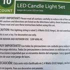 10 Count LED Candle Light Set Yellow Light With Green Wire Indoor and Outdoor Use 4.5 Ft(1.37m) Long -Lasting 25,000 Hour Bulb Life UL 120V 60 Hz AC 2.4 Watts(0.02 Amps) Sealed Box Unopened, New Year: 1990-2004