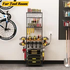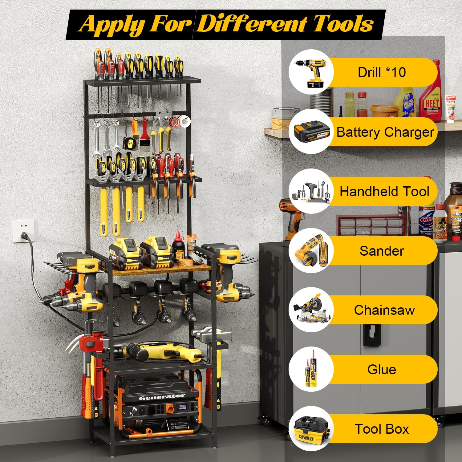 Our power tool organizer is space-saving and along with tons of drills holder and battery charging space. Built-in 6 outlets metal heavy duty power strip, not only charge your batteries, but also supply power to power tools. Save the cost of purchasing additional power strip. ใ๐๐ฎ๐๐ ๐๐ต๐ฎ๐ฟ๐ด๐ถ๐ป๐ดใ: The tool storage organizer built-in a power station with 6 outlets that can help you charge rechargeable tools conveniently. Output: 125V/15A/1875W. 6.5FT 14AWG power cord included. ใ๐๐ฎ๐ป ๐ฆ๐๐ผ๐ฟ๐ฒ ๐ฉ๐ฎ๐ฟ๐ถ๐ผ๐๐ ๐ง๐ผ๐ผ๐น๐ใ:This is a large capacity power tool organizer that includes 3 shelves, one charging station, slots for 8 drills, 44 holes, 10 hooks and 2 metal frames, which can easily hold tools such as drills, screwdriver, sander, scissors, hammer, tool box,etc. ใ๐๐ฝ๐ฝ๐น๐ ๐ณ๐ผ๐ฟ ๐ ๐๐น๐๐ถ๐ฝ๐น๐ฒ ๐ฆ๐ฐ๐ฒ๐ป๐ฎ๐ฟ๐ถ๐ผ๐ใ:This power tool stand shelf has a compact structure, which can categorize and store all kinds of tools. Help you quickly find desired tools to improve work efficiency. Perfect for garage, workshop, tool room, etc. ใ๐ฆ๐๐๐ฟ๐ฑ๐ & ๐๐๐ฟ๐ฎ๐ฏ๐น๐ฒใ: Our cordless tool organizer is made of quality metal material and thicken MDF board, structure of Iron wood combination design and made well ensure the tool organizer be very sturdy and durable. ใ๐๐ฎ๐๐ ๐ง๐ผ ๐๐๐๐ฒ๐บ๐ฏ๐น๐ฒใ:Our power tool rack provide clear instructions, labeled parts, and installation steps .You can easily assemble the entire unit in just 15-20 minutes, saving you time and effort.