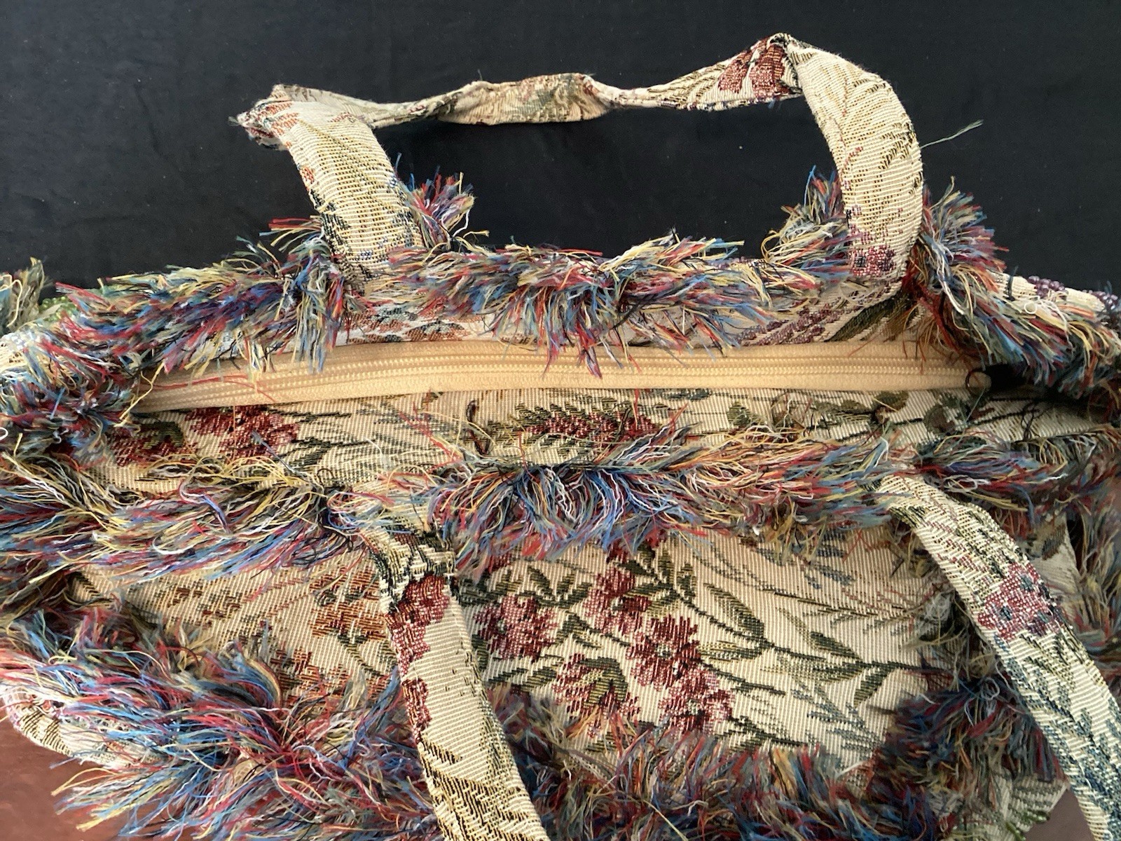 This Floral & Beaded Tapestry Purse is a colorful and stylish accessory for women, featuring a vibrant multicolor design with intricate floral patterns. The purse is made in India from cotton material and accents with fringe details, adding a touch of unique flair to the overall design. With double straps and a top handle style, this purse is perfect for adding a pop of color and personality to any outfit. BEADING IS ON ONE SIDE OF TAPESTRY AND PLAIN TAPESTRY ON OTHER SIDE. COMES WITH REPLACEMENT BEADS IN INSIDE ZIPPER POCKET. ZIPPER CLOSURE. MEASURES: 14” WIDTH X 10” DEPTH X 4.5” BOTTOM WIDTH.