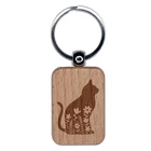 Floral Cat Engraved Wood Rectangle Keychain Tag Charm