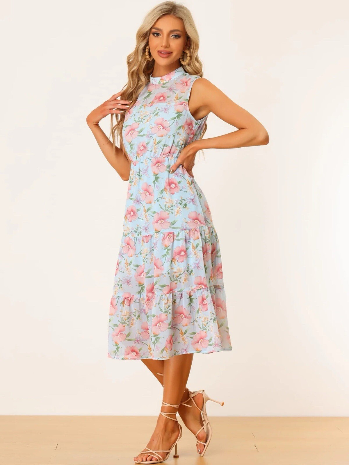 Emanate effortless charm in the Allegra K Floral Midi Dress, a versatile piece that transcends occasions from business meetings to casual outings, and even to sophisticated evening cocktails. The light blue hue is complemented by an alluring floral pattern, creating a look that's both elegant and eye-catching. The mock neck design adds a touch of formality, while the ruffle accents and tiered detailing provide a playful flair, perfect for beachside gatherings or transitional spring weather. Crafted from smooth polyester fabric, this sleeveless dress promises comfort and ease of movement. It's a regular size L, ensuring a flattering fit for a variety of body types. Whether you're dressing up for a formal event or dressing down for a relaxed day out, this dress is a go-to choice for a stylish and chic ensemble.