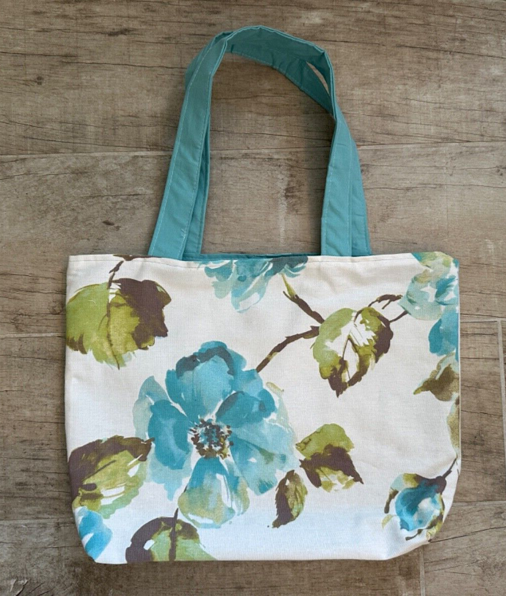 Crafted with care, these handmade tote bags bring a burst of floral charm to your everyday ensemble. Featuring a vibrant exterior made from high-quality cotton material, these totes are as functional as they are stylish. The large size ensures ample space for your essentials, while the multicolor straps provide a comfortable and secure grip. The interior boasts a complementary multicolor lining, adding an extra pop of color to the bag's overall design. The snap closure ensures your belongings stay safe and organized. Whether you're running errands or enjoying a day out, these tote bags are a perfect accessory for any occasion. A variety of choices to choose from. Approximate Tote Bag Measurements: Green Floral Height 14.5"Length 18.5" Black Floral: Height 13.5 Length 18" Light blue Floral: Height 14" 17" Length Blue And Pink Floral: Height 13.5" 17" Length