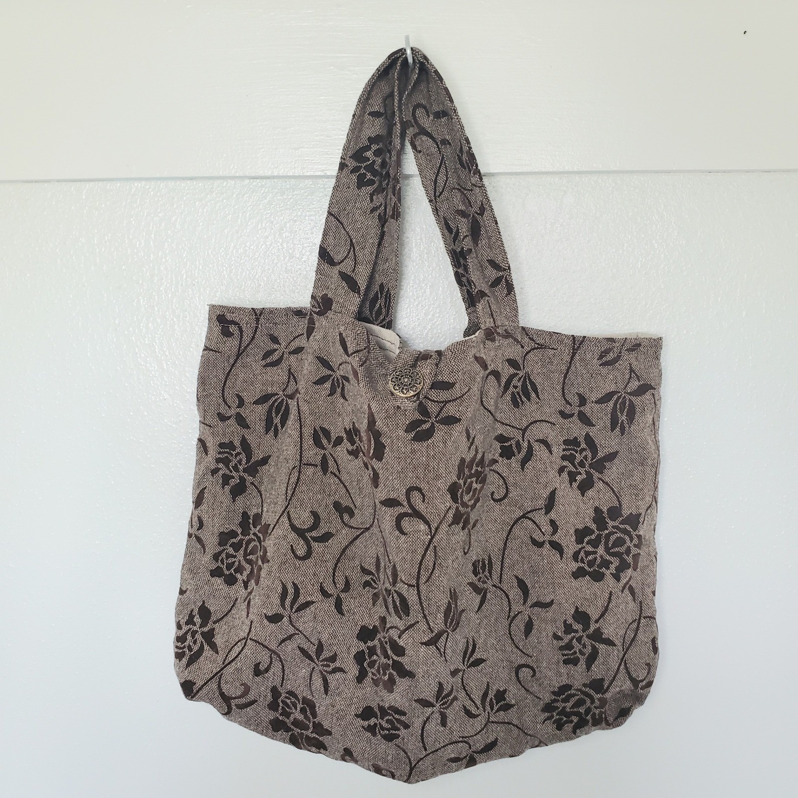 Elegant tapestry tote bag featuring a brown floral pattern. This chic bag offers a unique look with its decorative, vintage-style brass button closure and lined interior with an inner pocket. Perfect for everyday use, this stylish tote is ideal for carrying books, groceries, or personal items. Suitable for a casual brunch, shopping trips, or as a statement piece at a farmers market. Exterior Material: Tapestry Style: Tote Exterior Color: Autumnal Brown Department: Women Lining Color: Beige Handle/Strap Color: Brown Handle/Strap Material: Canvas Lining Material: Canvas, Fabric Hardware Color: Gold, Brown, Beige Pattern: Floral Tapestry Character: Bohemian Closure: Button Keywords: tote bag, shoulder bag, tapestry bag, floral tote, vintage style, boho bag, decorative button, lined tote, inner pocket, brown tote bag, beige tote bag, everyday bag, casual tote