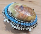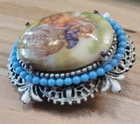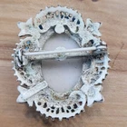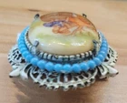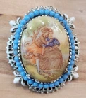Add a touch of vintage elegance to your outfit with this beautiful Florenza Victorian Revival Brooch. The brooch features a stunning scence of a young couple in love, transfer glass design with multicolor beads and a focal point of turquoise. The piece is signed by the brand and is a unique addition to any jewelry collection. This brooch is perfect for those who appreciate vintage jewelry and want to add a touch of history to their wardrobe. . Add this exquisite brooch to your collection today!